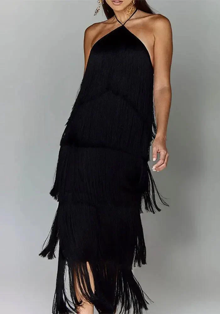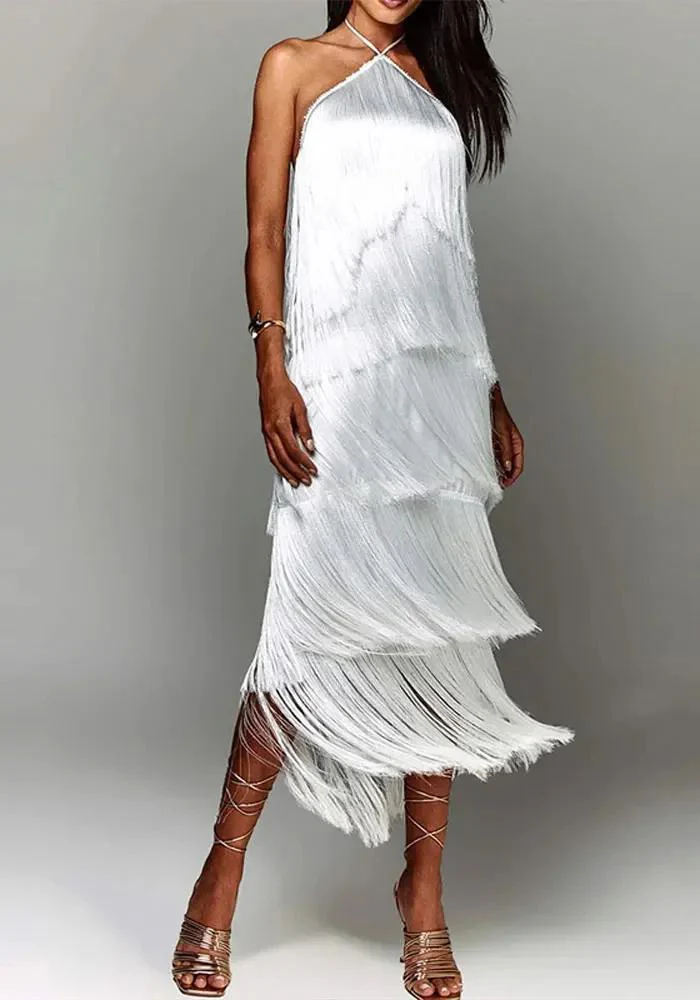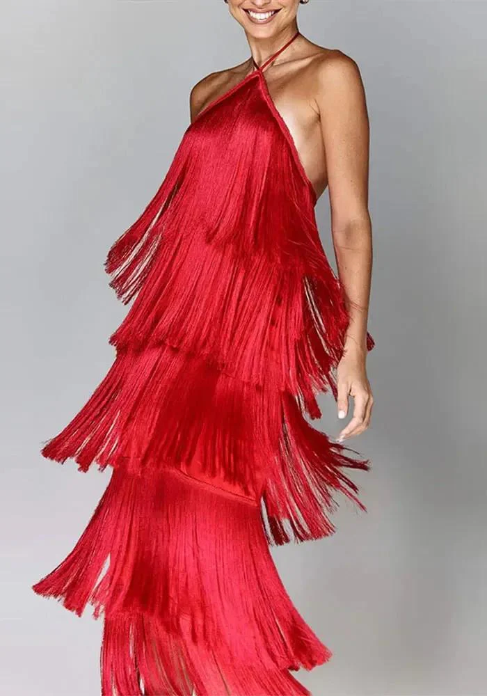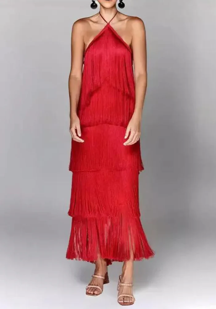 Cette robe droite mi-mollet est une pièce unique offrant un confort exceptionnel tout en rayonnant d’élégance. Les bretelles croisées au cou ajoutent une touche de sophistication, tandis que l’assortiment de couleurs – dorée, rouge, noir et blanc – permet de trouver la nuance parfaite qui correspond à votre style. La robe est dotée d’une texture satinée délicate et de franges en étages qui créent un mouvement gracieux à chacun de vos pas. Confectionnée en polyester de haute qualité, elle assure une silhouette fluide sans manches pour un look à la fois classique et audacieux. Optez pour cette robe et faites de votre soirée un moment inoubliable.