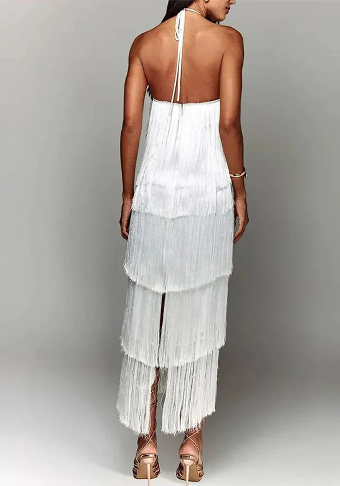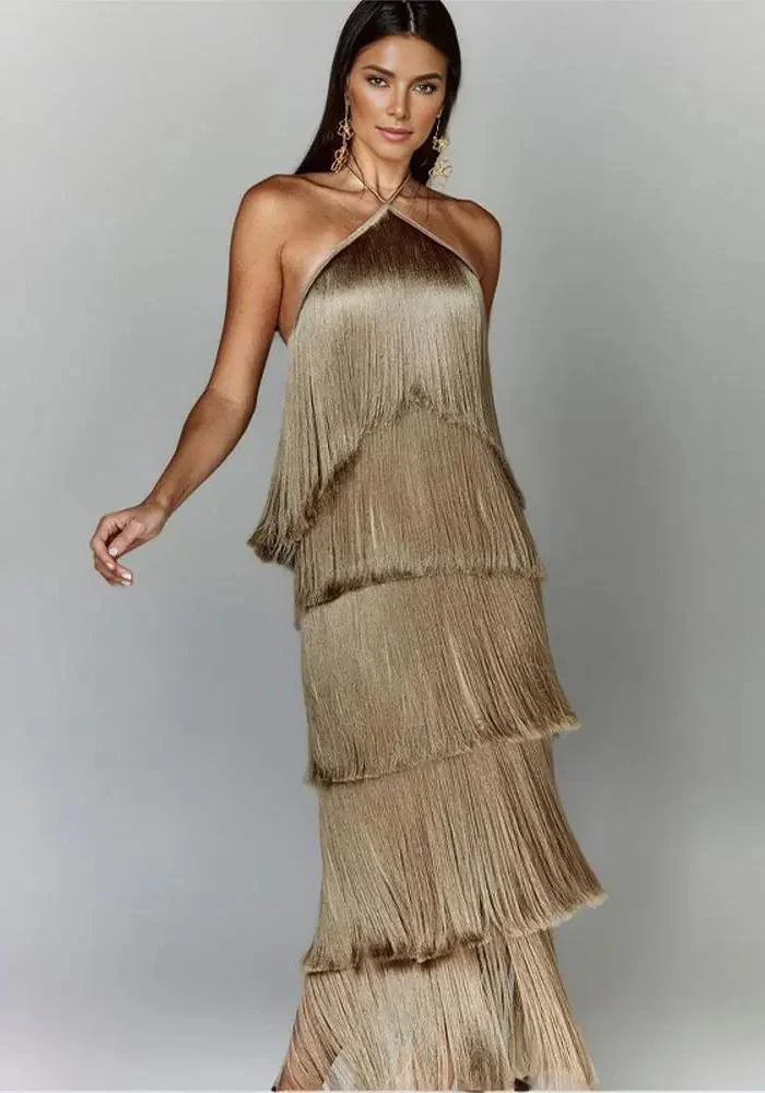 Entrez dans la lumière avec cette robe de soirée éblouissante. Chaque détail, des franges en étages à l’effet satiné, a été pensé pour que vous soyez la reine de la soirée.