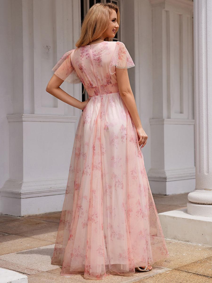 Respirant la beauté et l’élégance, cette robe de soirée trapèze à col en V présente des manches courtes et une superbe superposition de tulle ornée d’un superbe motif floral.