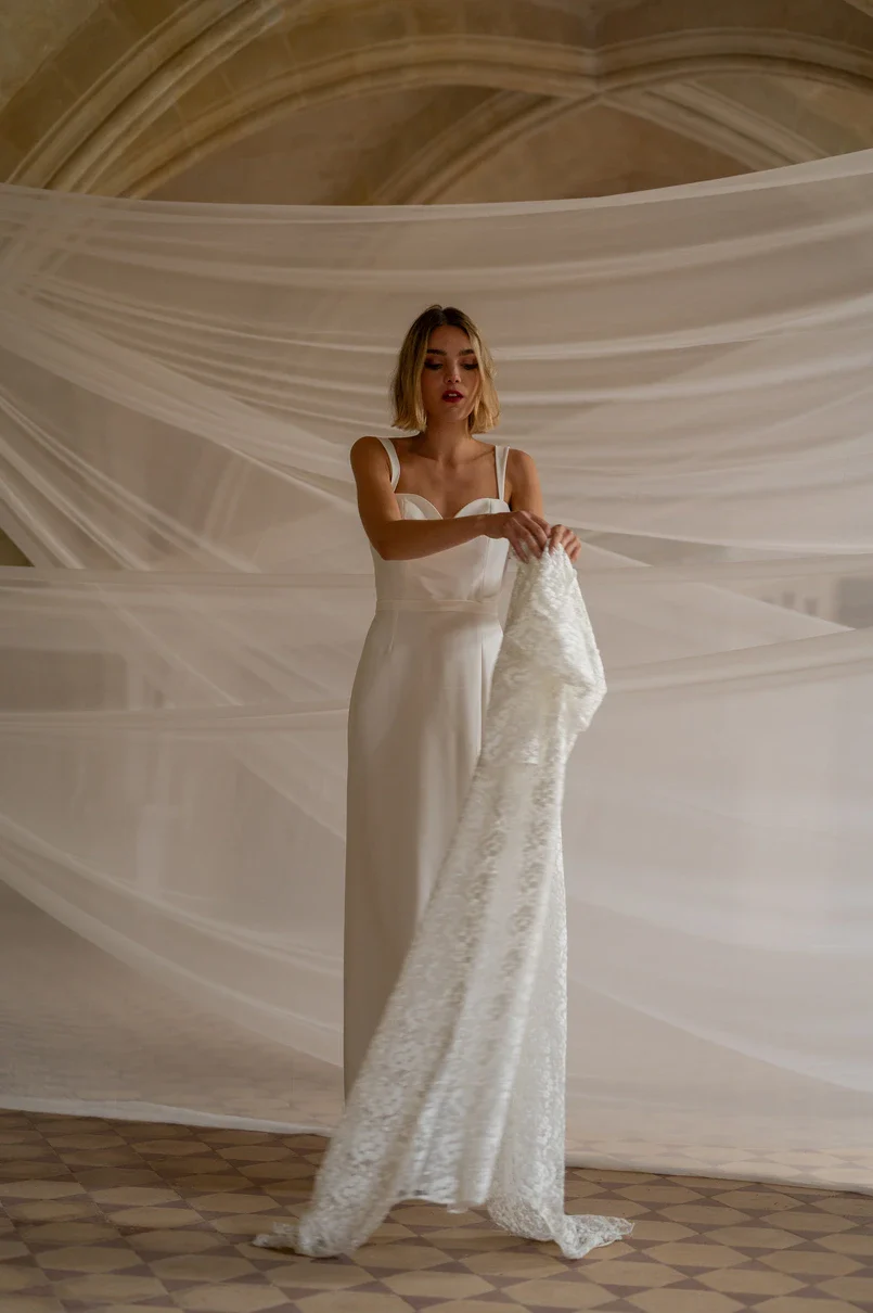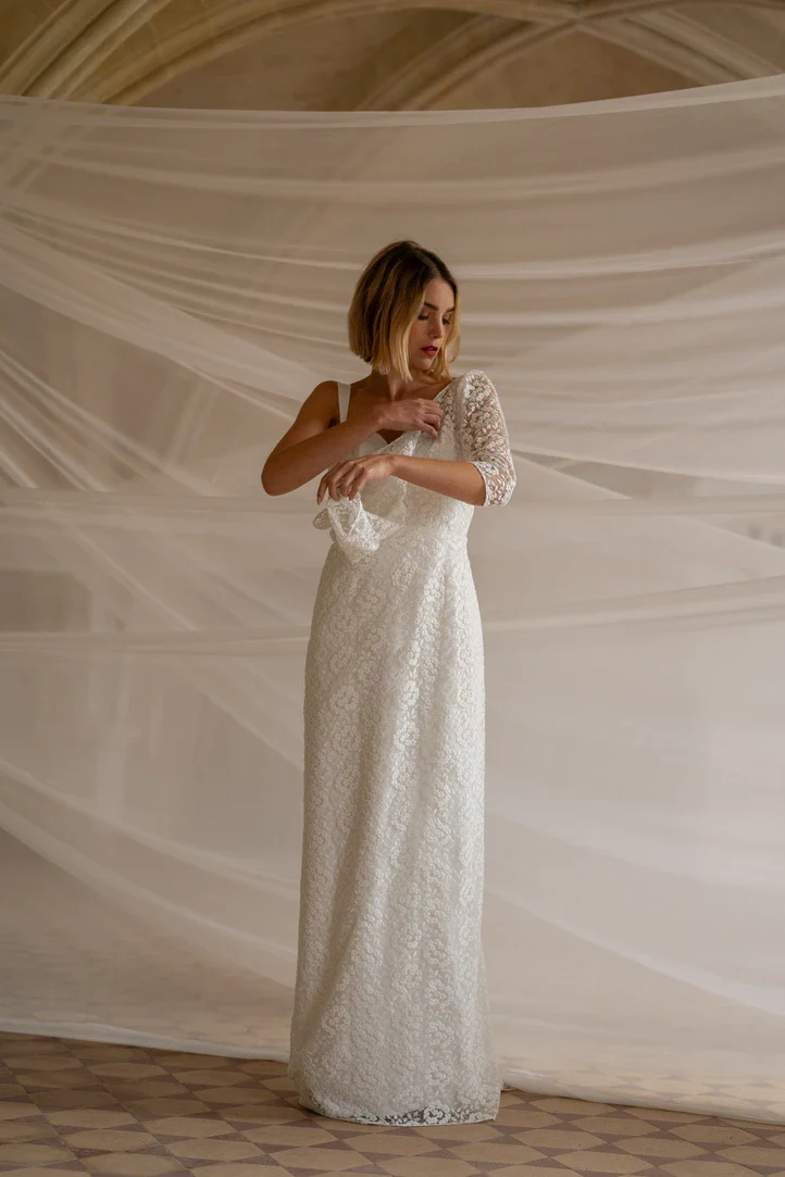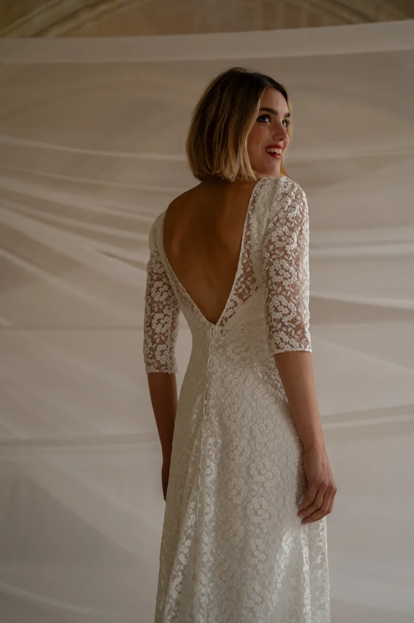Robe en dentelle non doublée en tulle brodé « dentelle de Calais ». Ses manches 3/4, son dos nu et sa ligne élancée donnera à votre tenue un style raffiné, simple et élégant. La robe est agrémentée de boutons délicats dans le dos, soulignant le dos nu tout en offrant une allure sophistiquée. A porté sur une robe à bretelle elle permet de créer un look deux en un pour un mariage en deux temps.