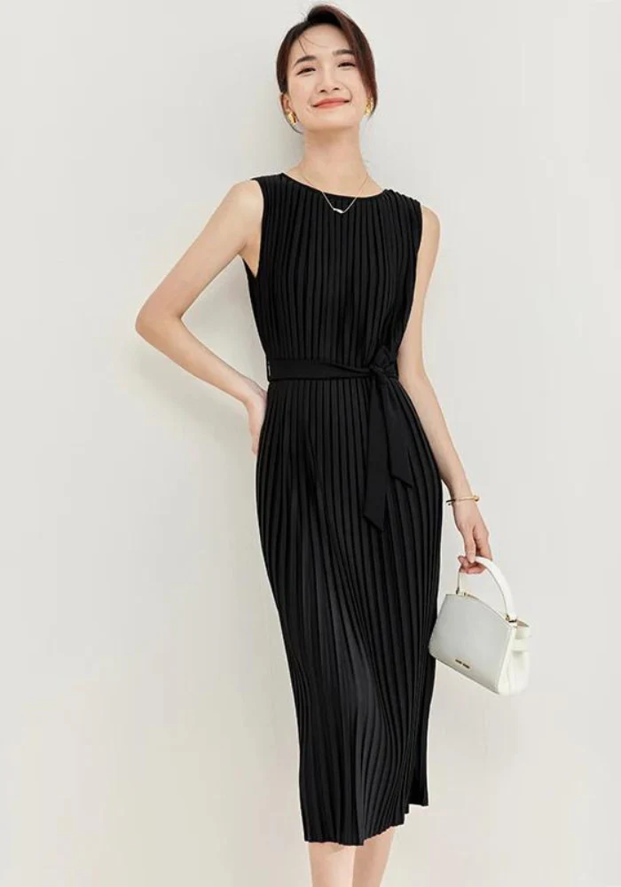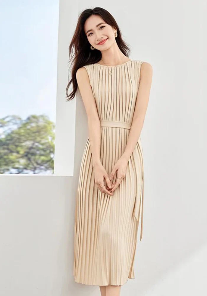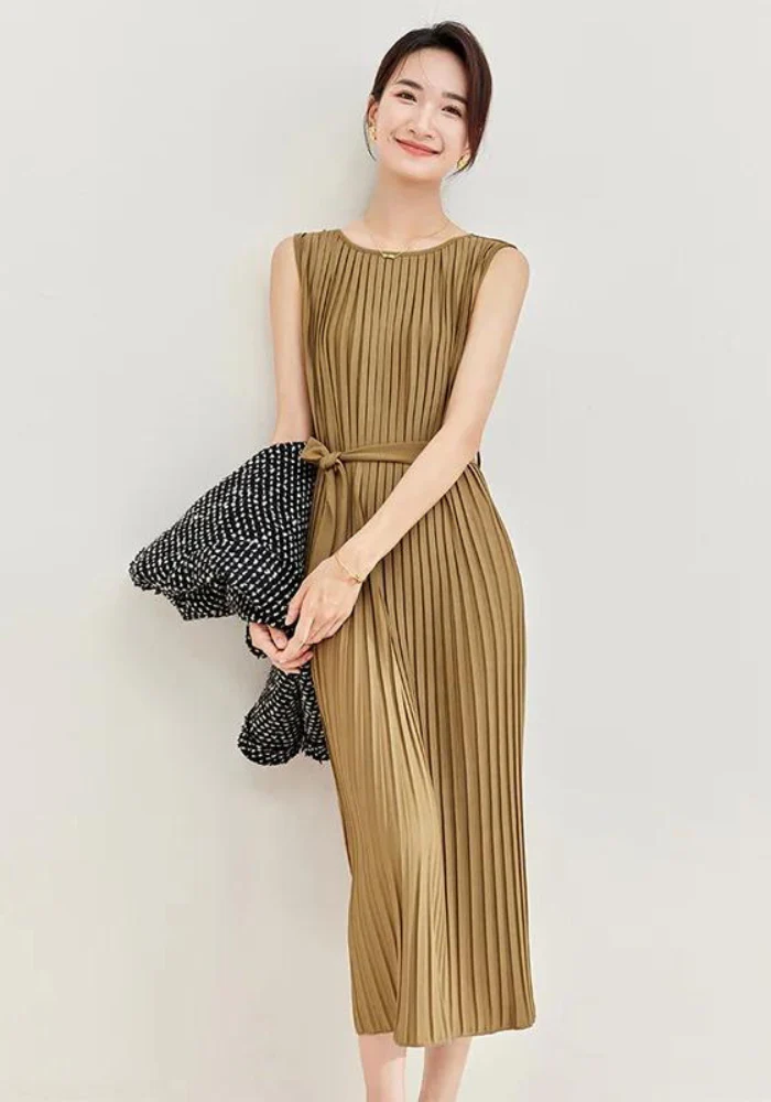 Détails : col rond, ceinture à nouer à la taille, ourlet plissé légèrement évasé, disponible en vert olive, brun, beige, et noir