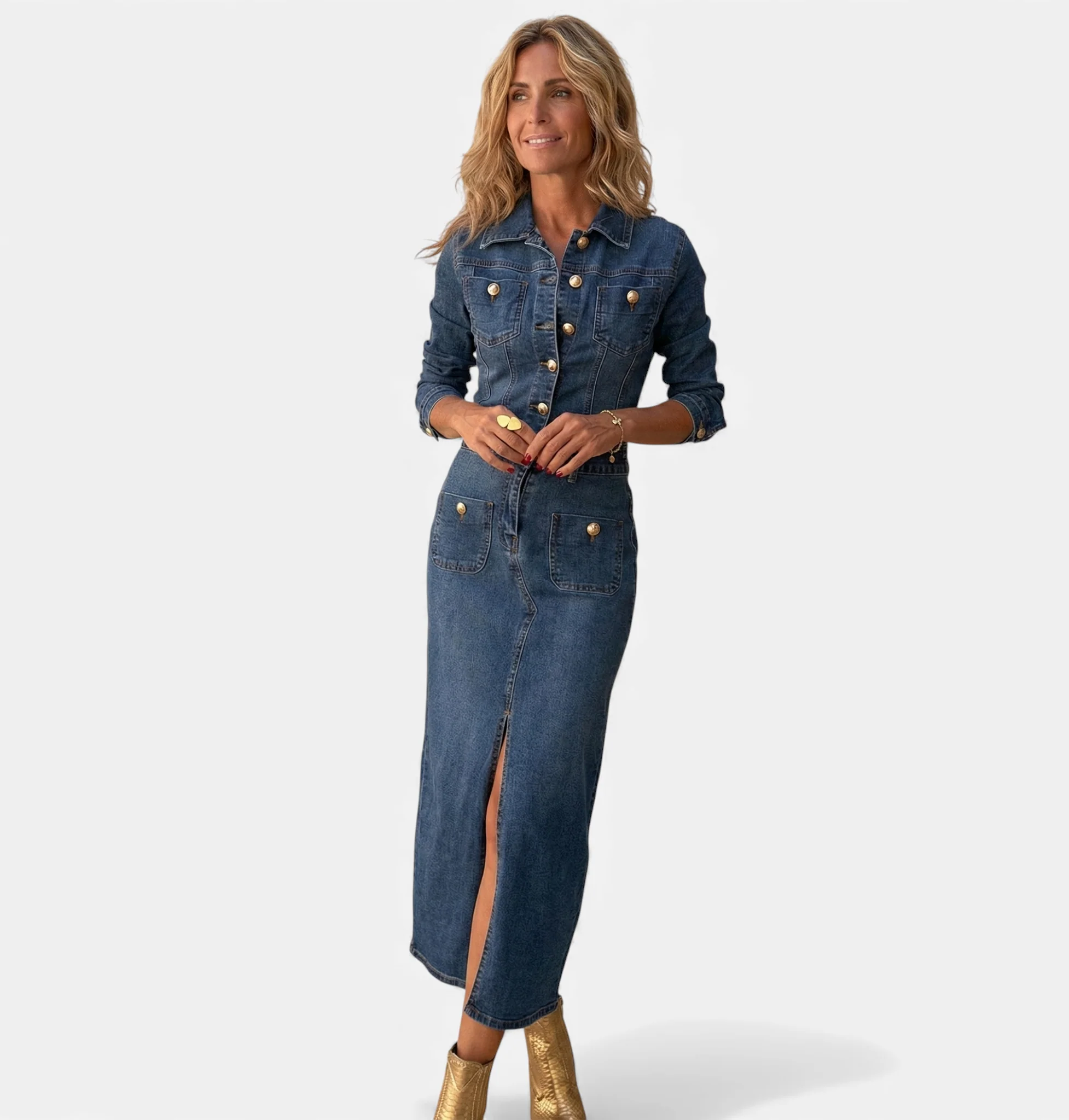 Cette robe en jean automne associe la netteté d’une ligne mi-longue à l’allure affirmée d’un col chemise boutonné. La coupe cintrée épouse le buste et marque la taille, offrant un maintien flatteur sans contraindre le mouvement. Les manches longues et la longueur midi en font une pièce adaptée à la mi-saison, portée aussi bien au bureau qu’en fin de semaine. Le denim à la teinte indigo légèrement patinée révèle un toucher dense mais souple, qui structure la silhouette sans rigidifier. Les surpiqûres contrastantes et la fente discrète à l’avant facilitent le pas, garantissant une allure moderne et maîtrisée au quotidien.