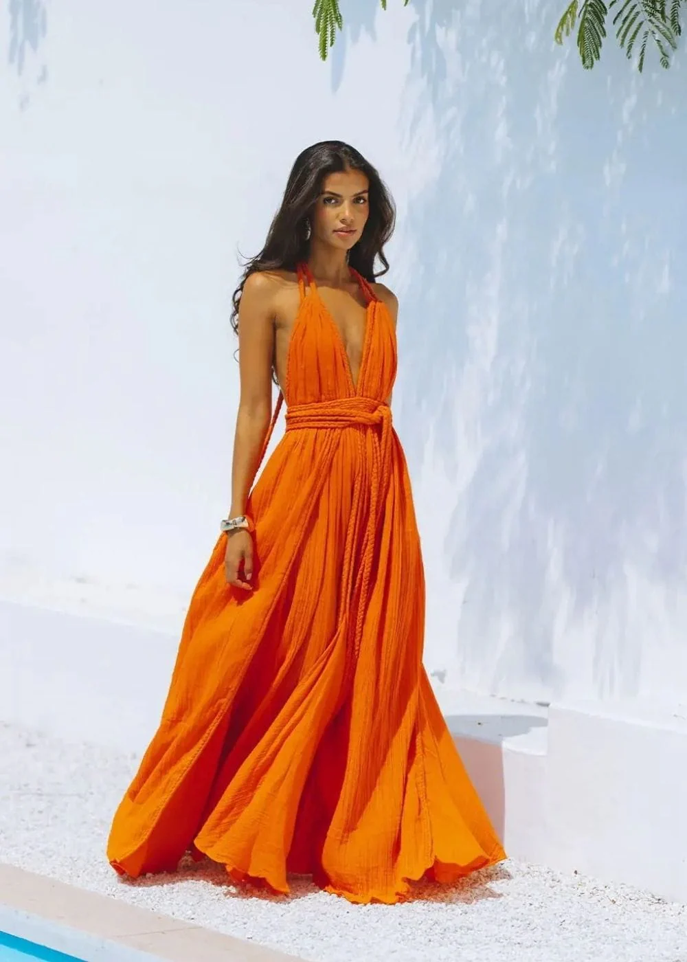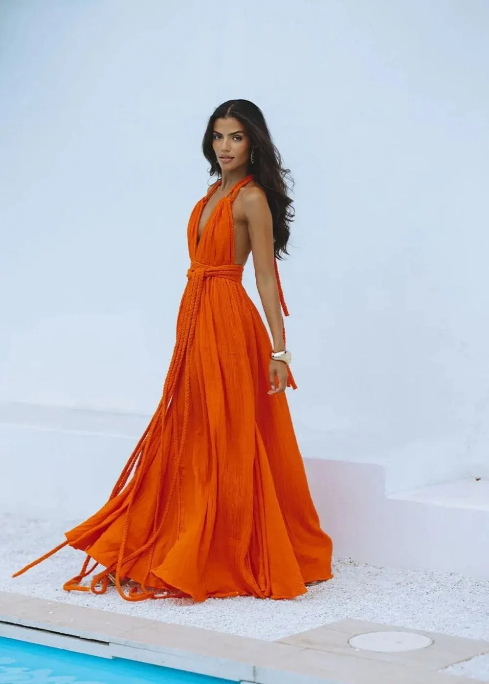 À la fois légère et captivante, cette magnifique robe été terracotta est une ode à la féminité estivale. Son tissu aérien épouse délicatement le corps, offrant une silhouette des plus avantageuses. Le décolleté plongeant met en valeur la nuque avec subtilité, tandis que le dos nu et les fines bretelles nouées ajoutent une touche bohème irrésistible. Son coloris lumineux évoque pleinement la chaleur des journées ensoleillées et ne laisse personne indifférent.