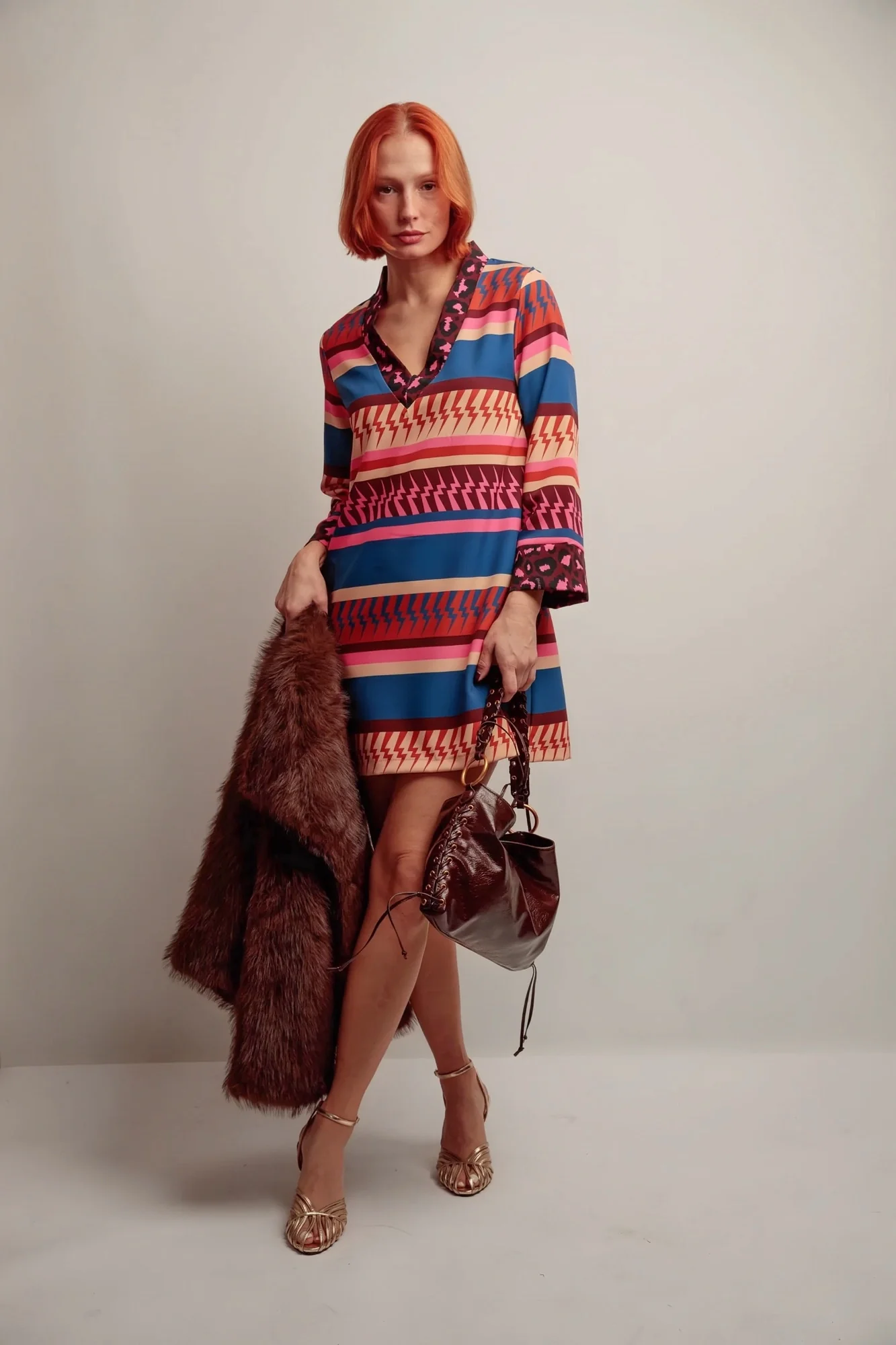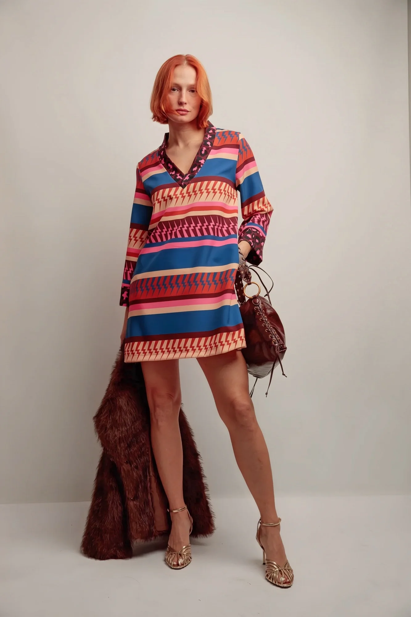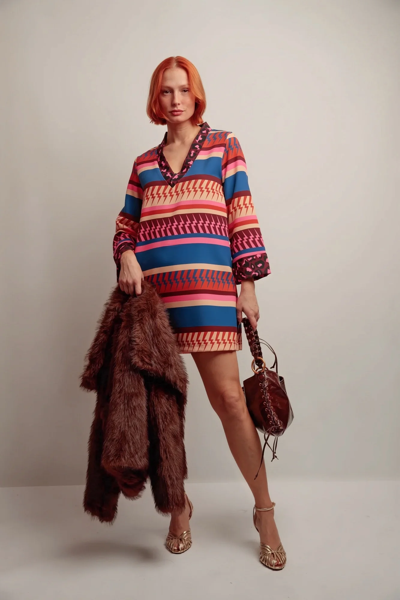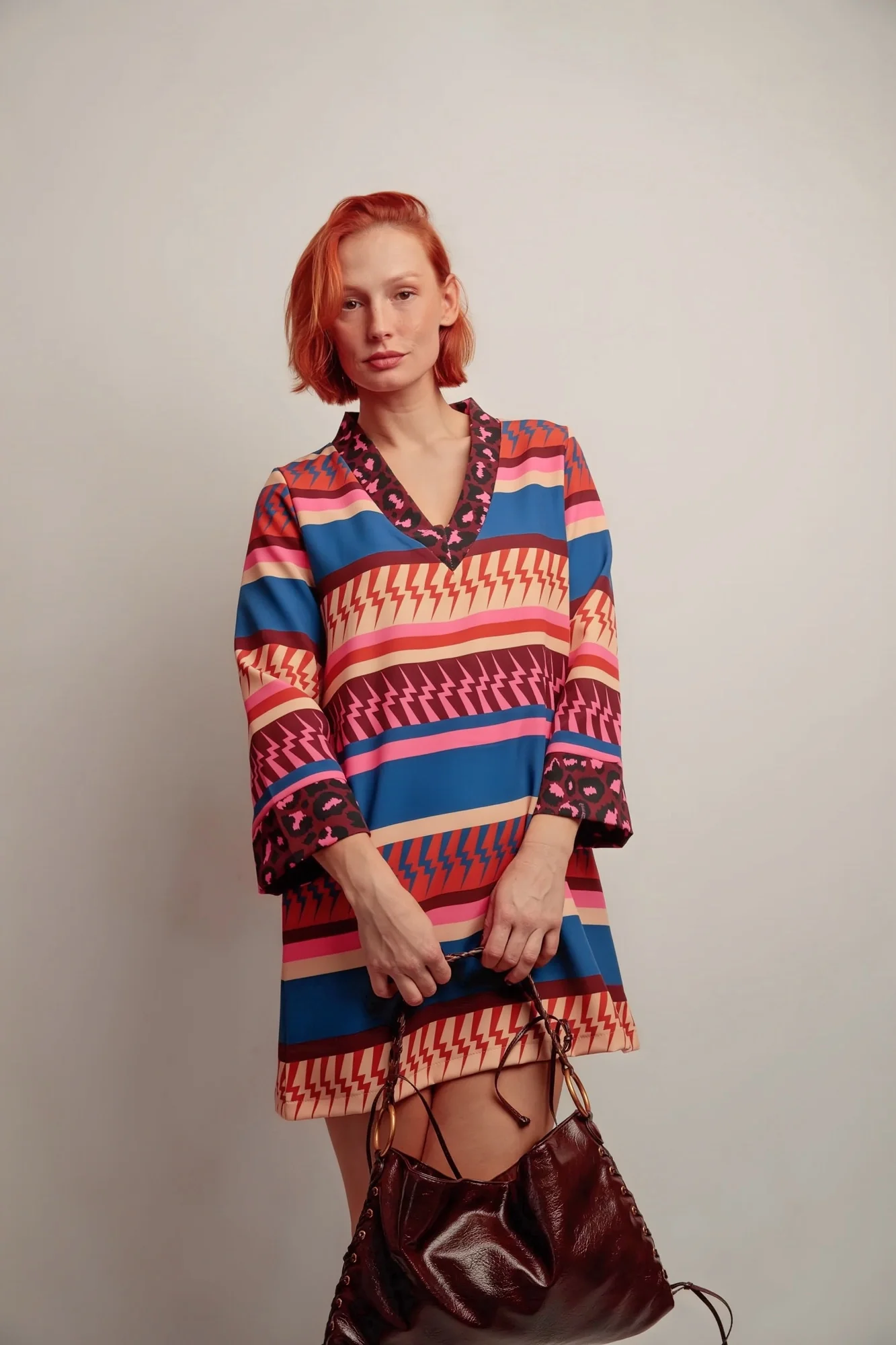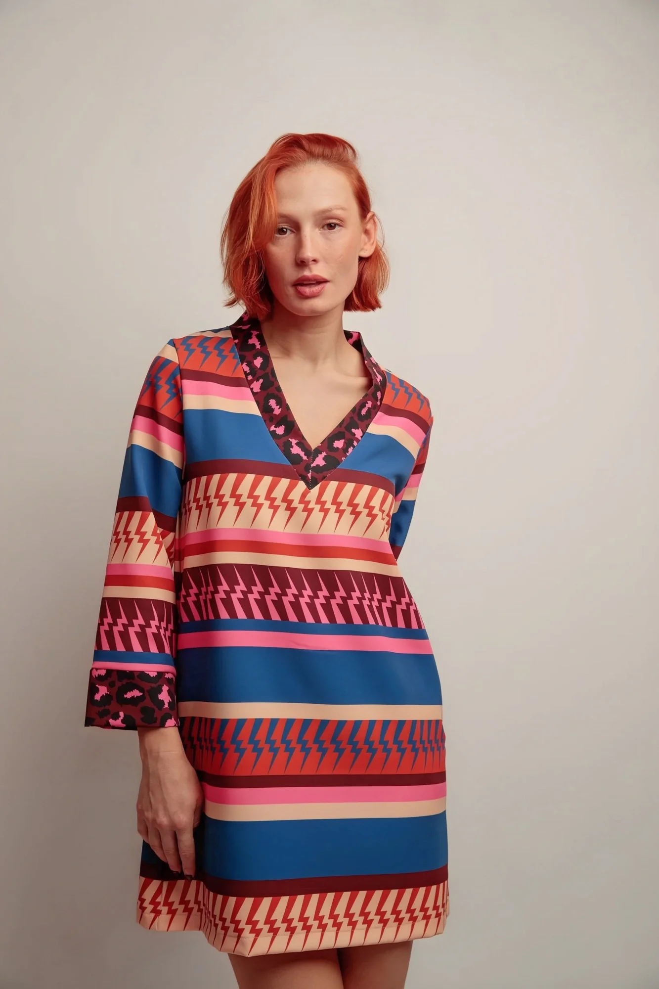 Une robe courte et fluide qui séduit par ses imprimés graphiques et son jeu de contrastes. Sa coupe évasée et son col en V mettent en valeur la silhouette tout en assurant confort et légèreté.