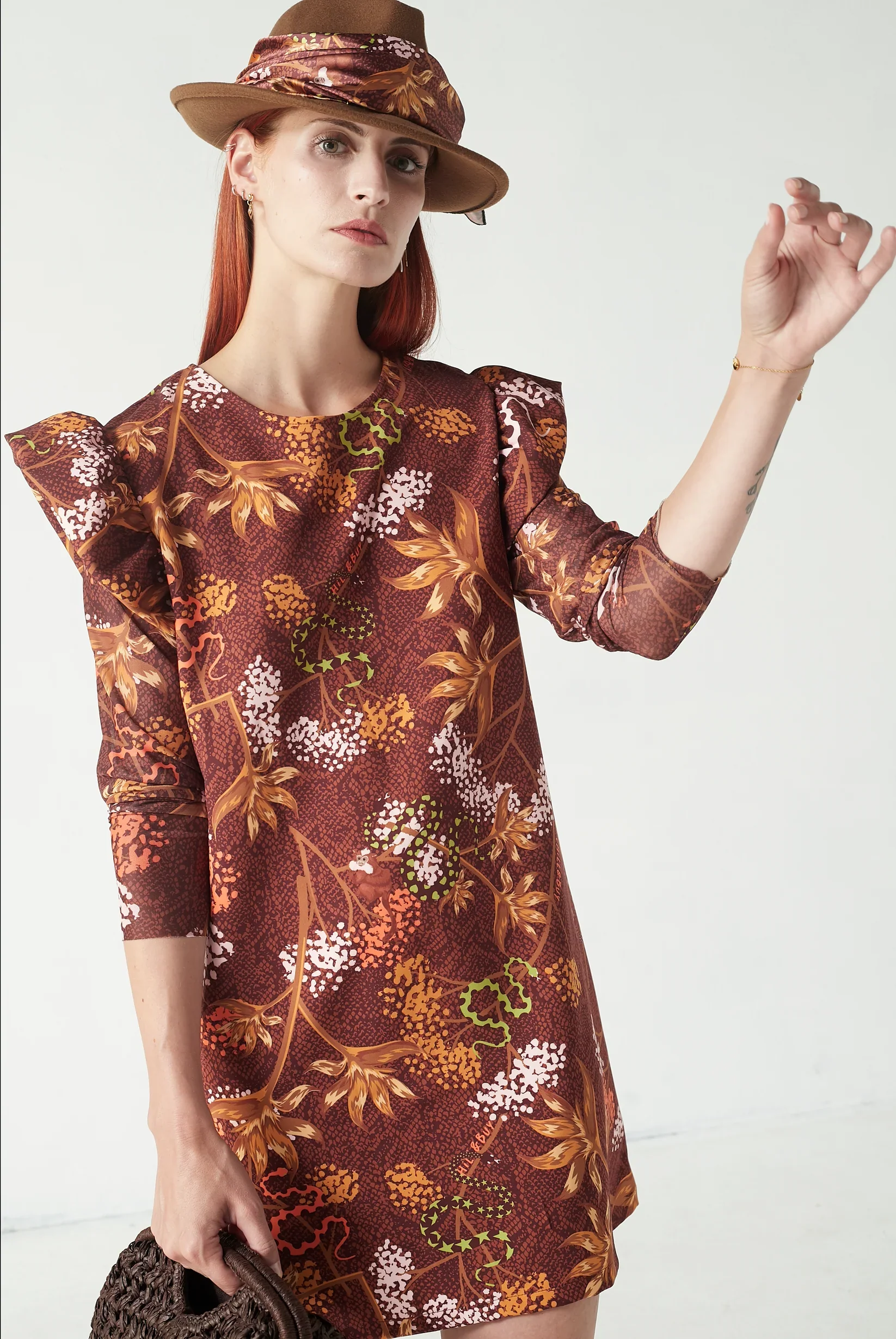 🔹 Détails marquants : manches longues en tulle imprimé serpent, petit volant aux épaules, poches latérales pratiques, col rond classique