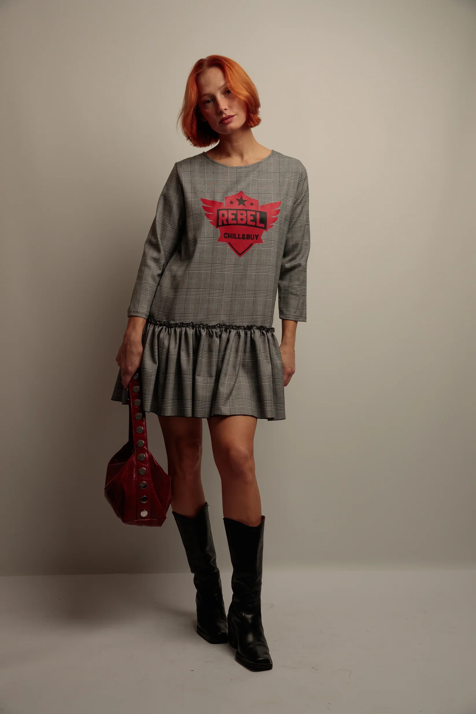 Cette version revisitee de la robe Gales Army affiche un motif prince de Galles accompagne d’un visuel rouge contraste qui dynamise la silhouette. Sa coupe evasee, ponctuee d’un large volant fronce au bas, offre un joli mouvement a chaque pas. Les manches longues et le col rond assurent une tenue confortable et facile a porter au quotidien.