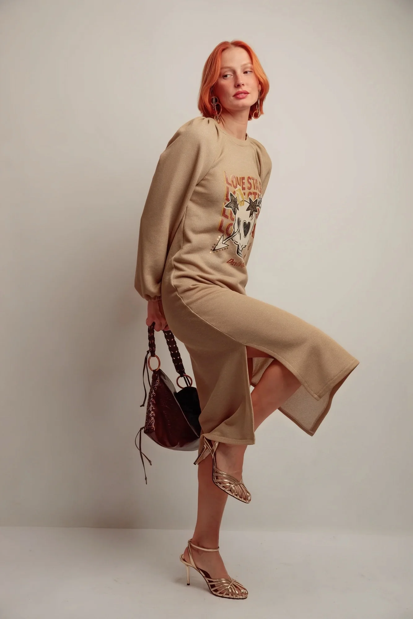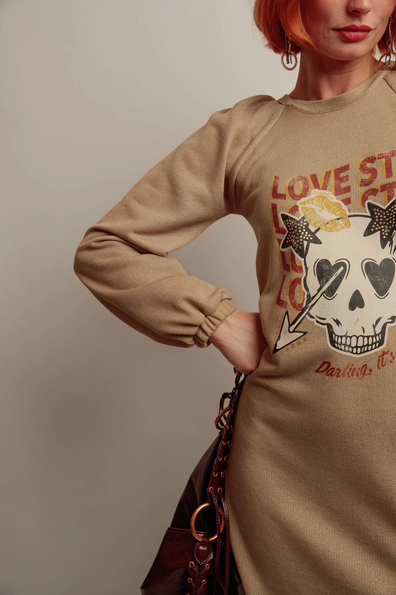🔹 Détails marquants : Encolure ronde, manches raglan longues et bouffantes resserrées aux poignets, imprimé discret à l’avant