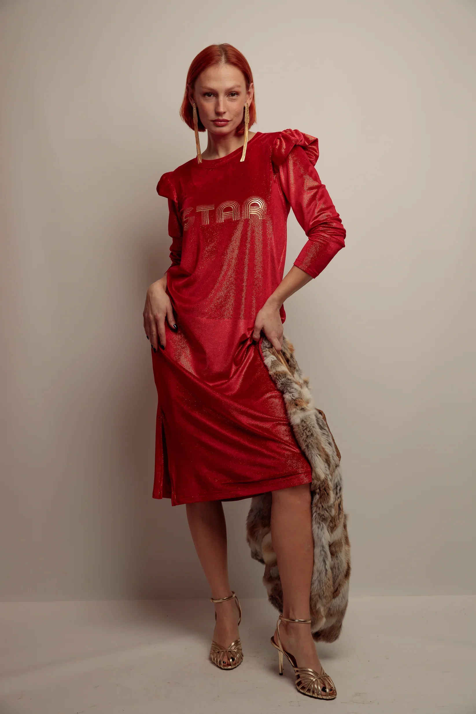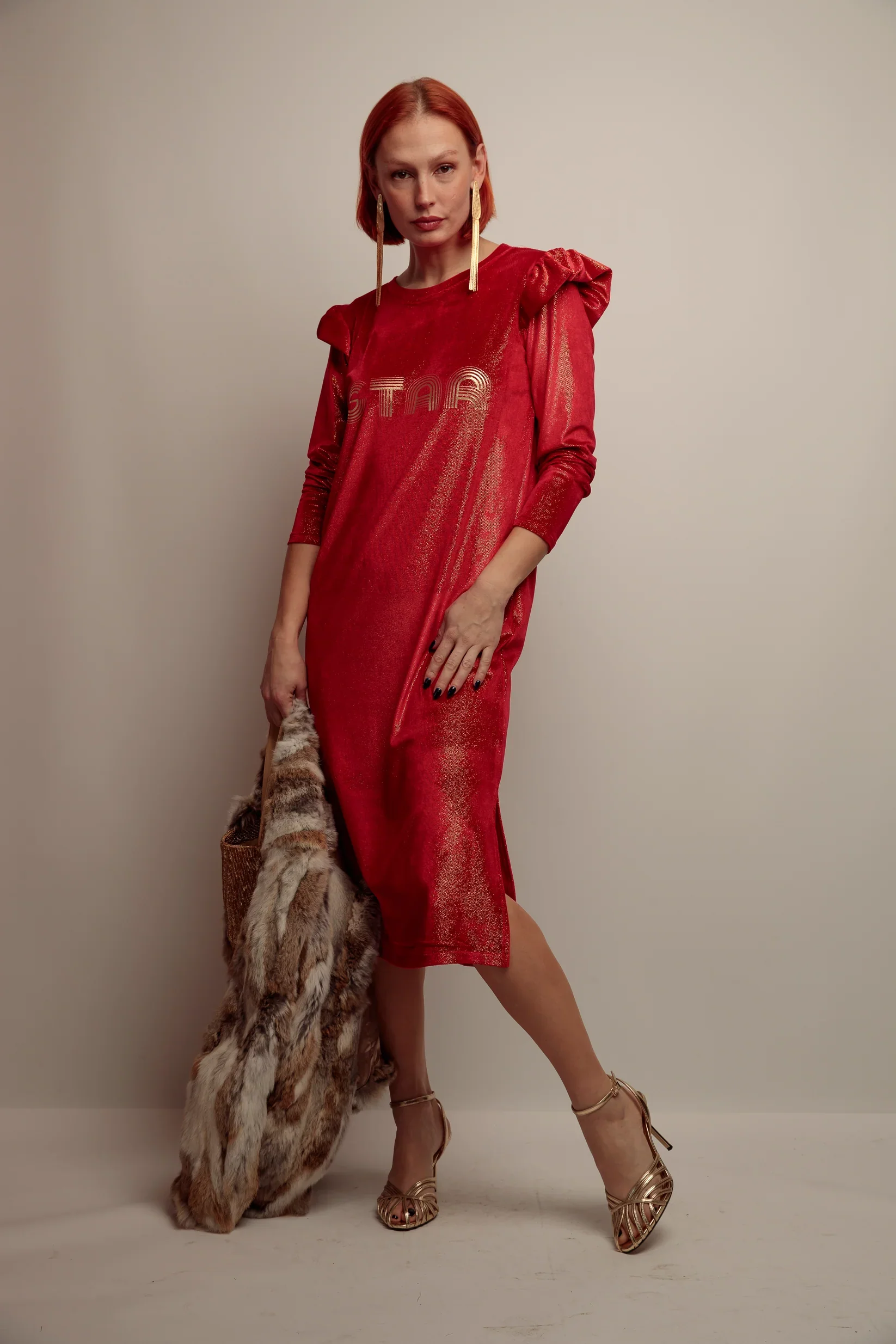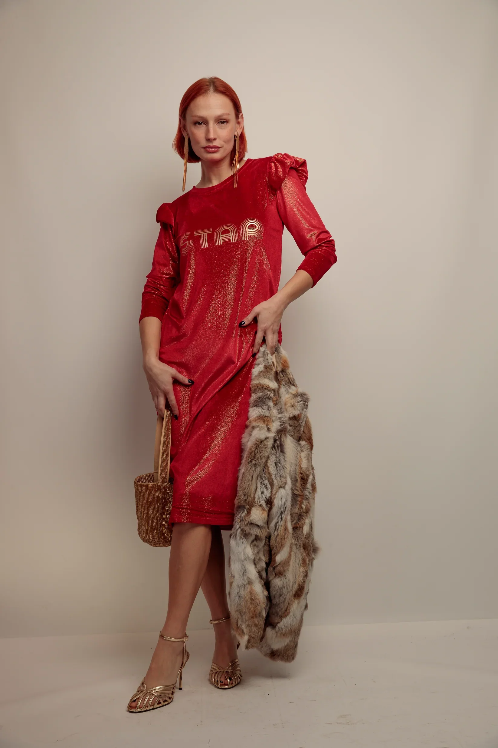 Un modelo midi en velours rouge doux ponctue de reflets dores, concu pour offrir une silhouette mise en valeur et un style lumineux. Son inscription “STAR” sur le devant ajoute une touche moderne qui contraste harmonieusement avec la texture du velours.