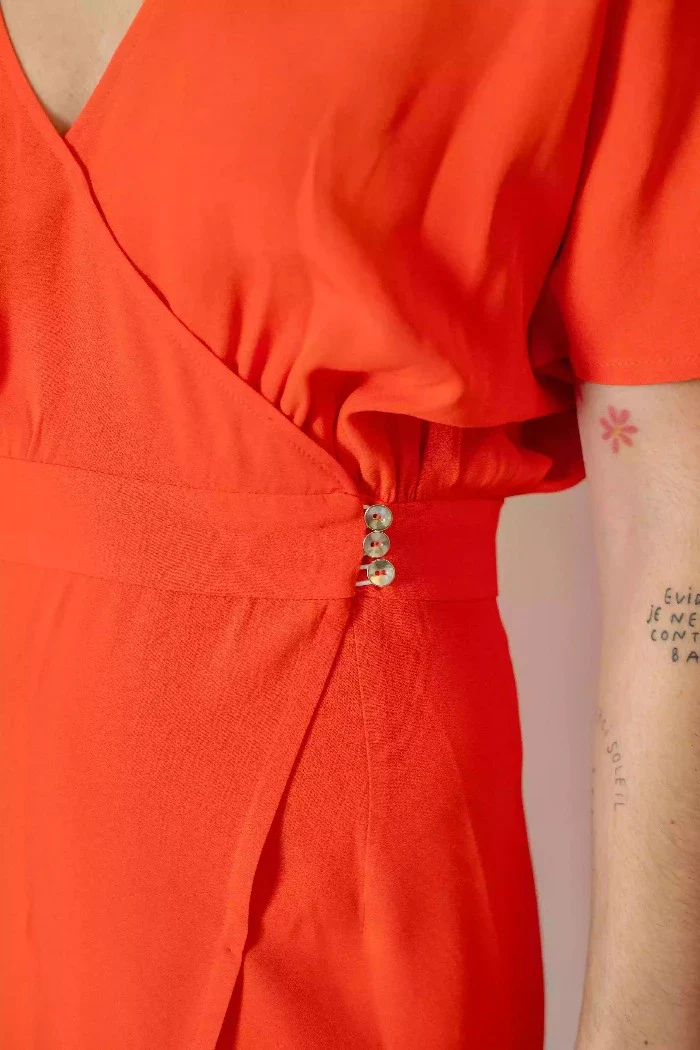 Ceinture prise en fourreau pour marquer la taille et 3 petits boutons dorés côté pour fermer la robe