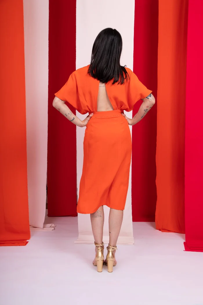 Robe portefeuille cintrée taille, manches chauve souris, jupe crayon avec fente côté mi-cuisse et dos triangle ouvert