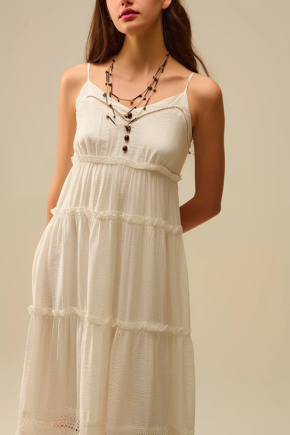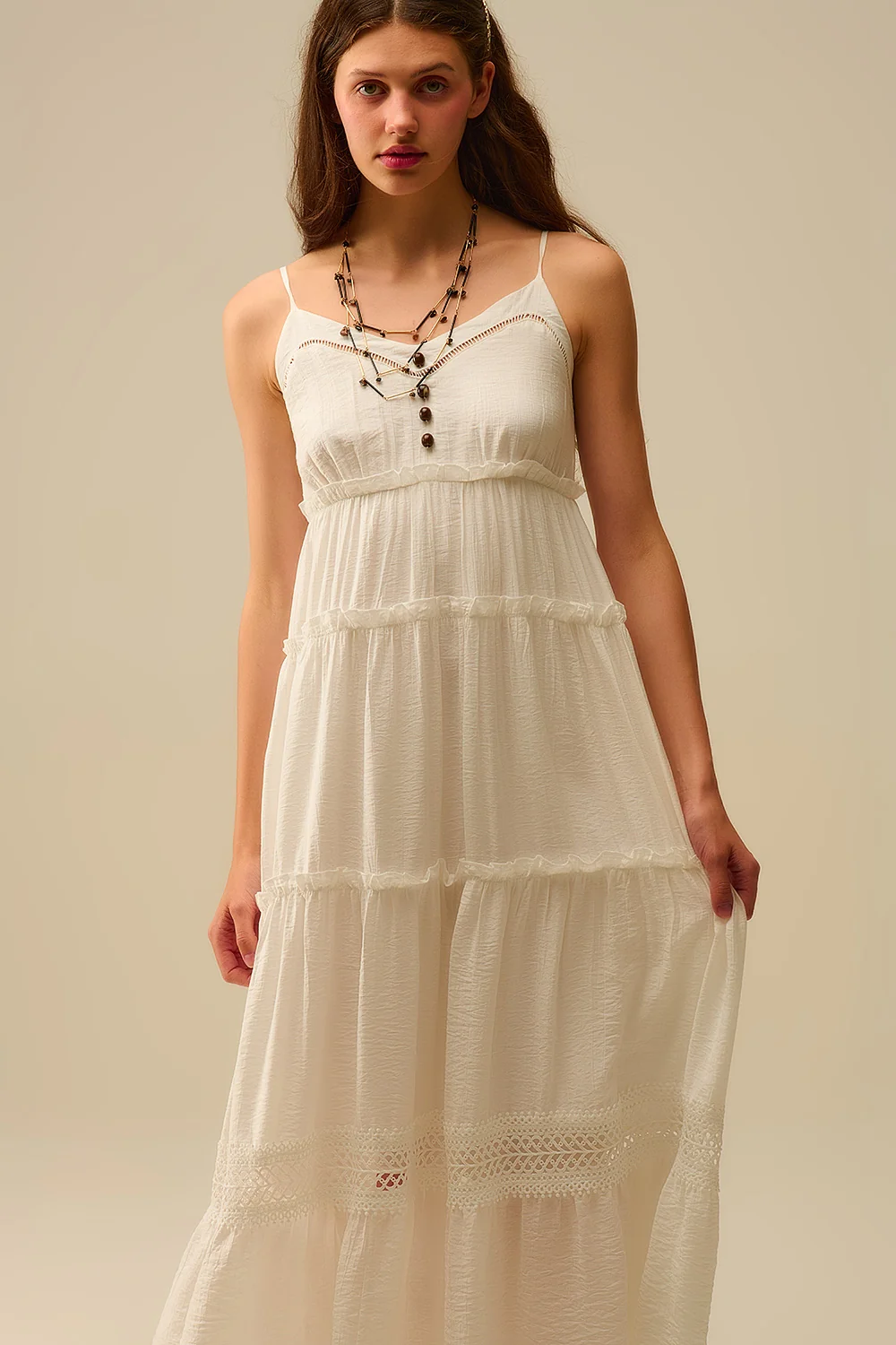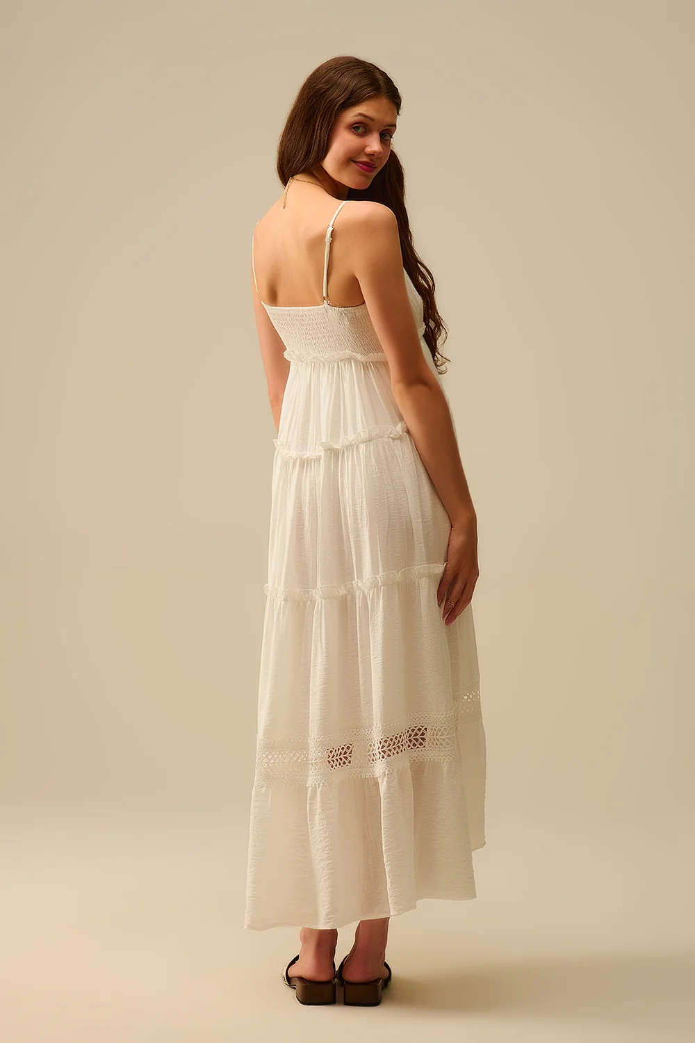 Robe longue à pinces avec empiècements en dentelle en blanc