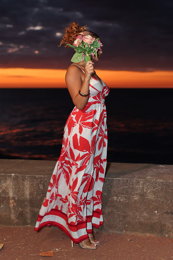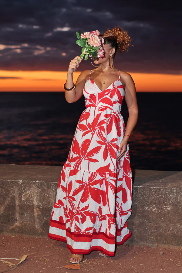 Cette robe longue fluide et élégante est une véritable déclaration de féminité. Avec son imprimé floral rouge éclatant sur fond blanc, elle attire le regard tout en restant chic et légère.