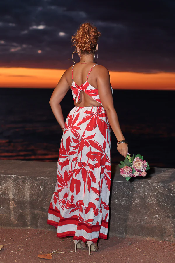 Cette robe longue fluide et élégante est une véritable déclaration de féminité. Avec son imprimé floral rouge éclatant sur fond blanc, elle attire le regard tout en restant chic et légère. Ses fines bretelles et son détail dos-nu noué apportent une touche sensuelle et moderne, parfaite pour vos soirées d’été, vos sorties en bord de […]