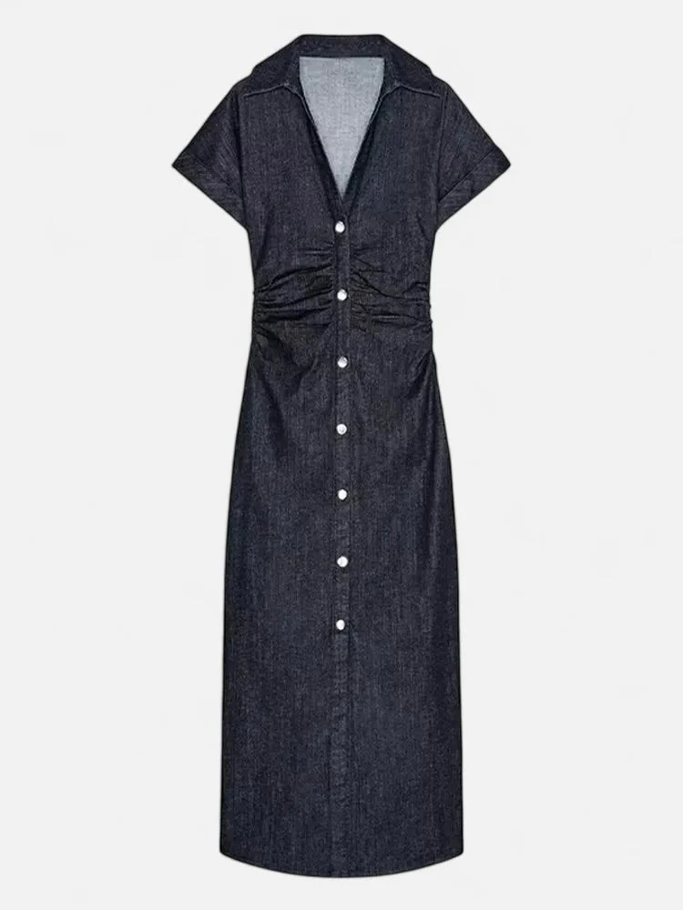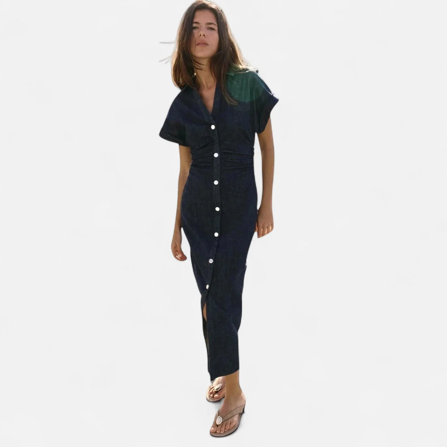 Taillée dans un denim bleu nuit profond à la texture légèrement patinée, cette robe longue dessine la silhouette par une coupe ajustée et une taille froncée qui structure le buste avec naturel. Le tissu dense mais souple garantit maintien et liberté de mouvement. La ligne de boutonnage blanc contrasté traverse toute la longueur, soulignant la verticalité du modèle. Le col chemise pointu et les manches courtes à revers apportent une note moderne. Elle descend jusqu’aux chevilles, offrant une couverture élégante adaptée aux contextes professionnels comme aux sorties plus détendues, du quotidien aux occasions affirmées.