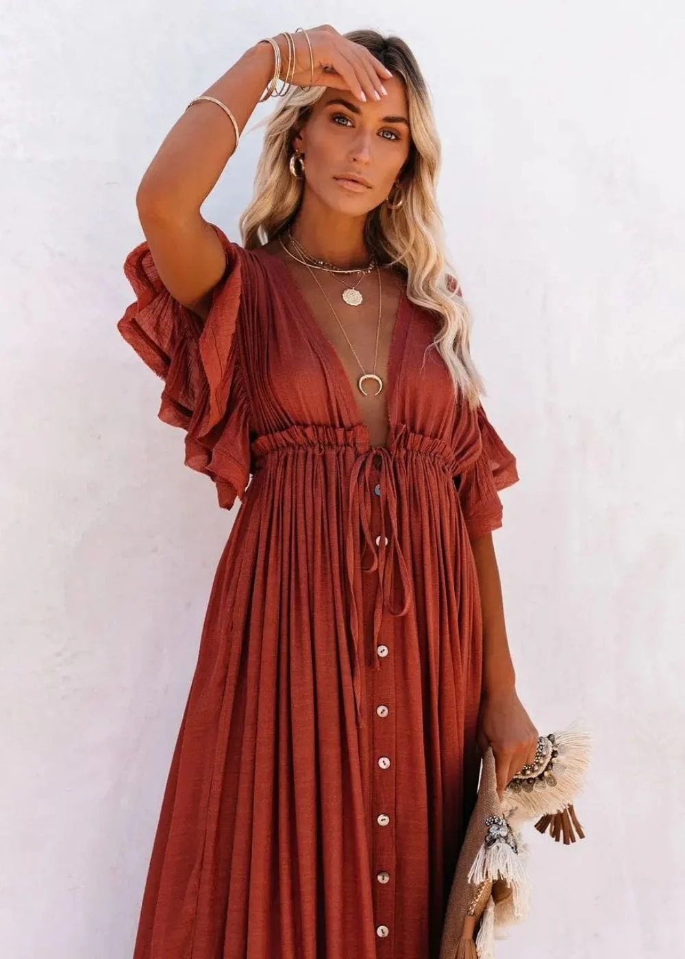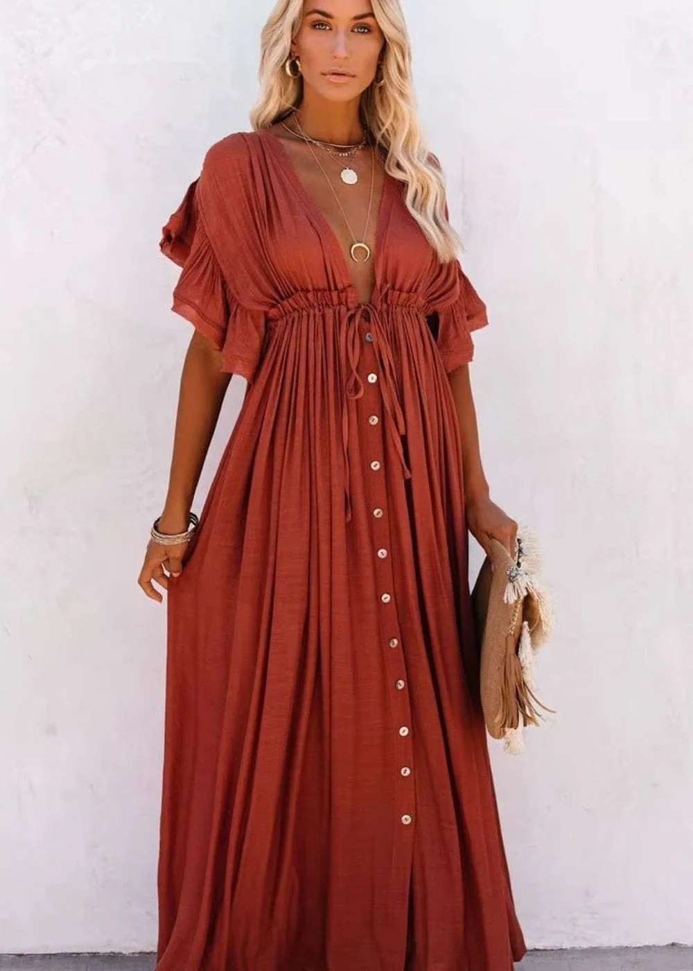 Cette robe bohème est un véritable must-have pour une garde-robe raffinée et romantique. Son coloris terracotta, à la fois chaleureux et intense, s’harmonise parfaitement avec toutes les carnations. Que ce soit pour une cérémonie ou une balade en bord de mer, elle apporte une touche d’élégance naturelle du plus bel effet.Ne passe pas à côté de cette pièce phare qui sublimera ton style bohème !