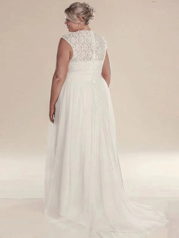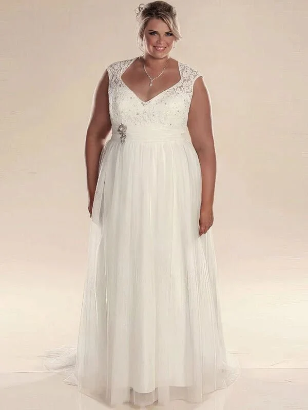 Voici la robe de mariée empire pour femme ronde de grande taille. Avec son tissu en tulle léger et délicat, cette robe vous fera sentir comme une reine le jour de votre mariage. La dentelle et les perles appliquées sont de véritables œuvres d’art, ajoutant une touche de brillance à votre tenue.