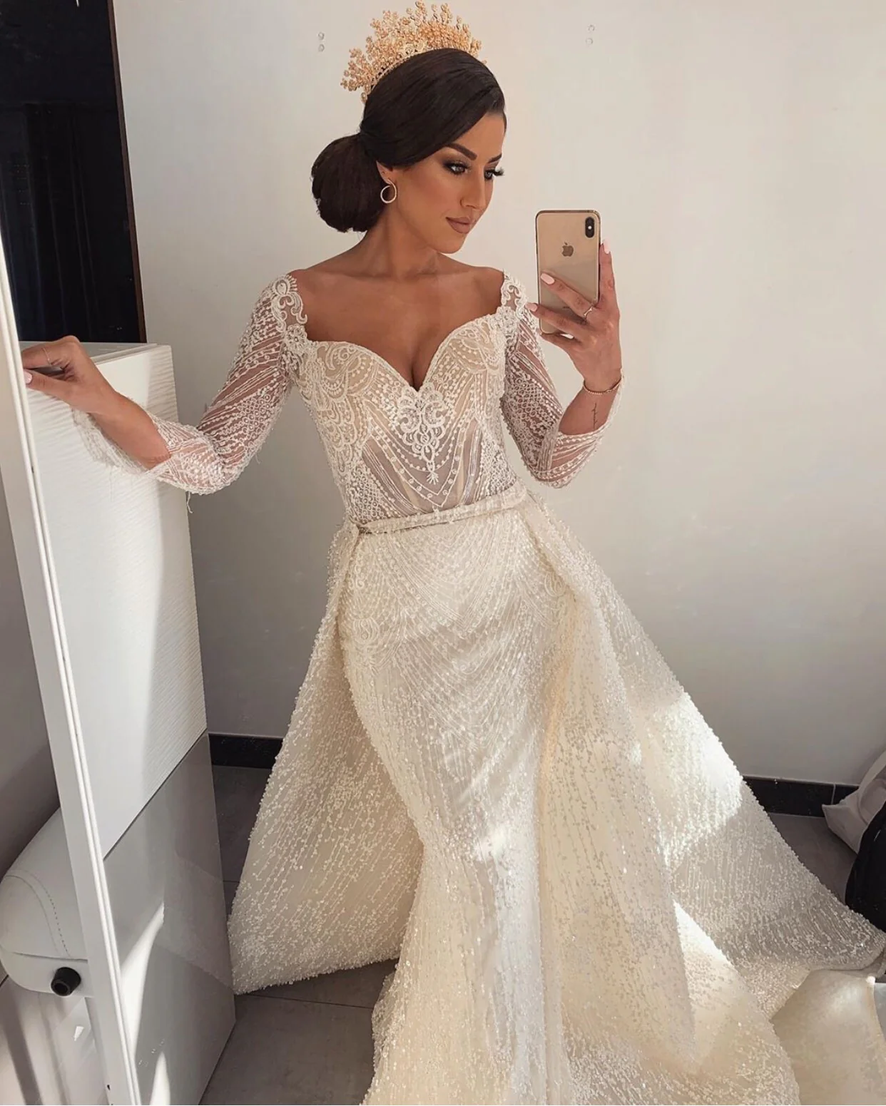 Robe de mariée haute gamme confectionnée avec la même dentelle en couleur blanche possibilité de rajouter une doublure pour cacher la transparence pour celle qui le souhaitent