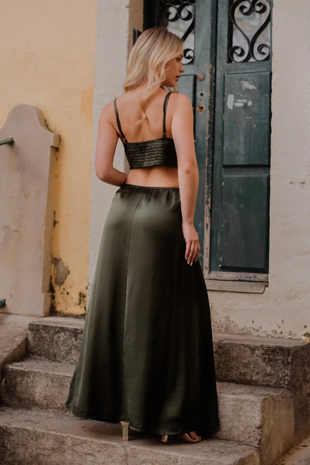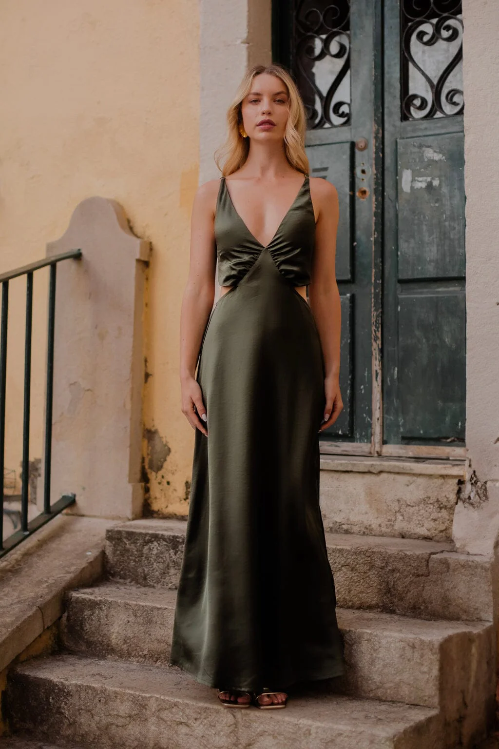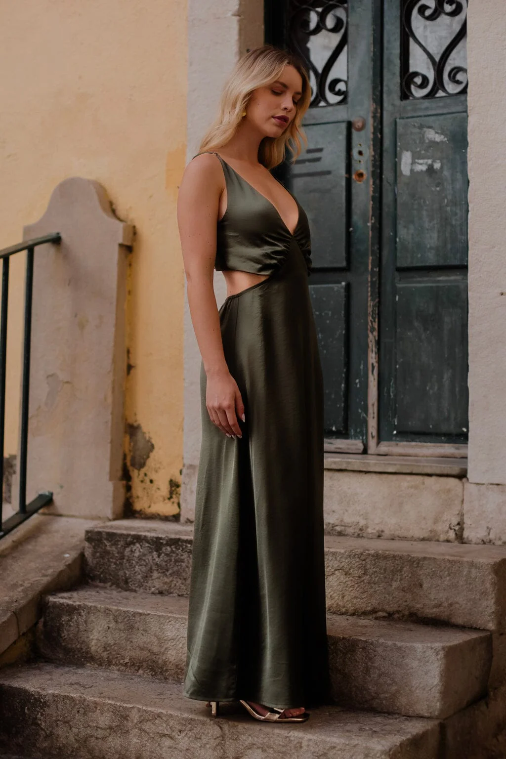 Cette robe longue et fluide à découpes est confectionnée dans un magnifique tissu satiné kaki. Son décolleté en V plongeant ajoute une touche sensuelle à cette pièce incontournable de votre garde-robe. Le dos élastique ouvert apporte une note de modernité et garantit un ajustement parfait. Parfaite pour les soirées chic ou les occasions spéciales, cette robe sera votre alliée mode incontestable.