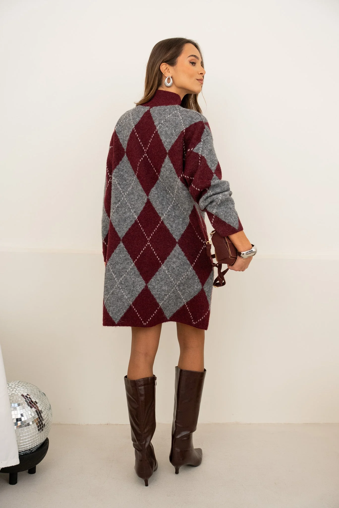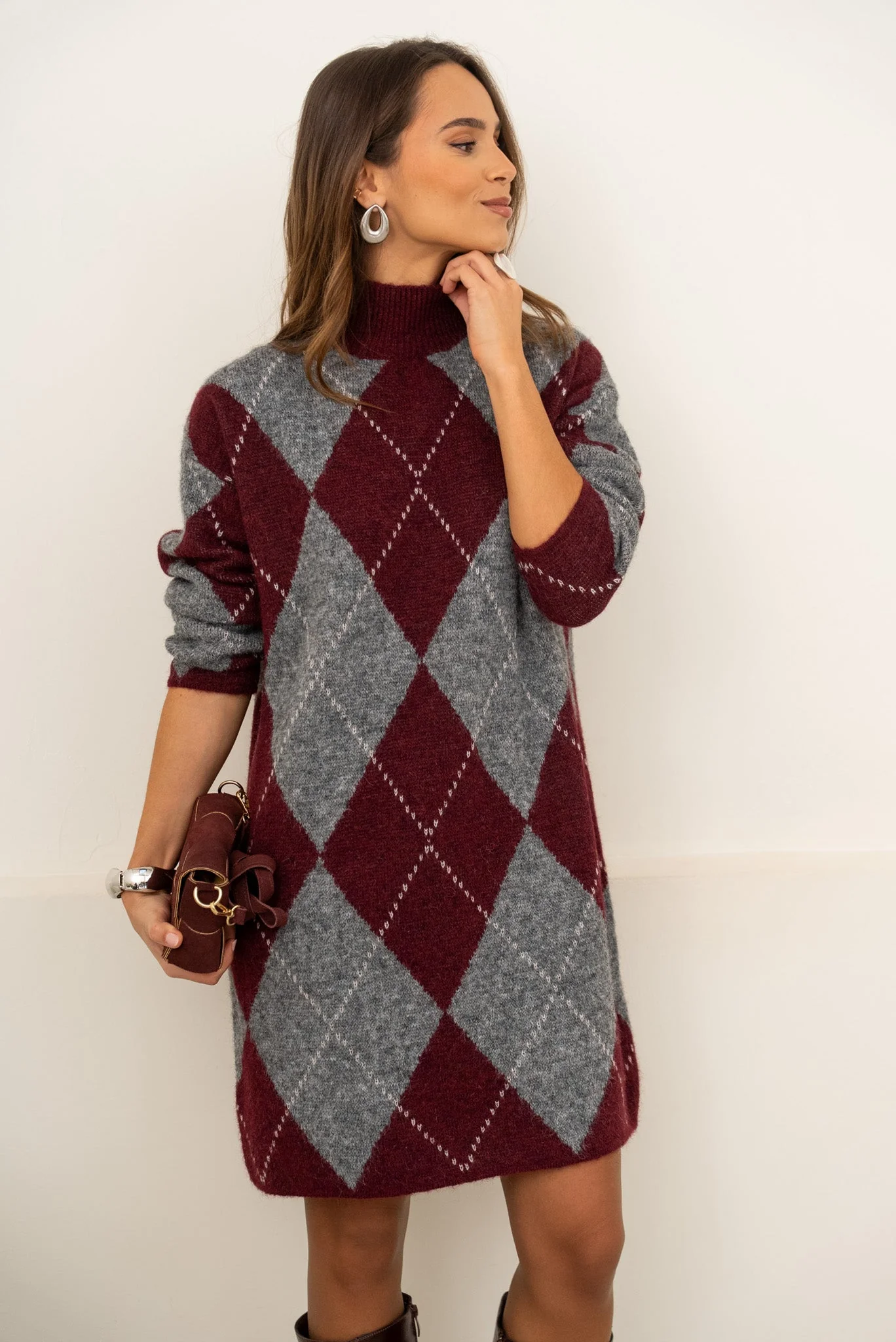 Robe pull manches longues Col montant Motifs losanges Mesures à plat en CM : Poitrine : TU 58 Longueur depuis épaule : TU 90 La mannequin mesure 173cm et porte une taille unique.