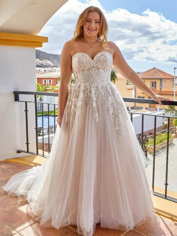 Notre robe de mariée taille plus en tulle est un choix incroyable pour la mariée romantique. Le tulle délicat de la robe vous enveloppe dans une douceur aérienne qui vous fera sentir comme une princesse. La robe est accentuée par des motifs appliqués de dentelle, ajoutant une touche de sophistication et d’élégance.