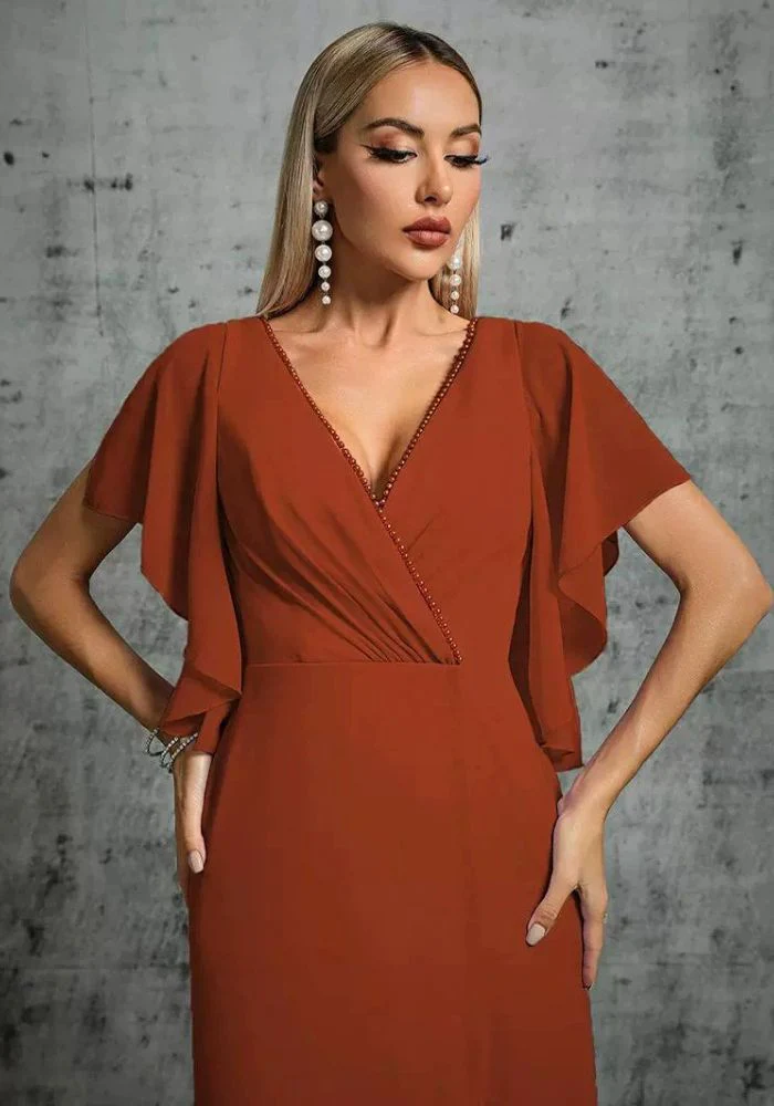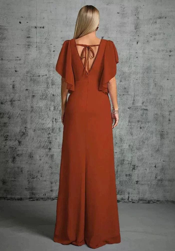 Rayonnez lors de votre prochaine cérémonie avec cette robe longue terracotta. Sa coupe chic et ses manches papillon apportent une allure sophistiquée, idéale pour une invitée, demoiselle d’honneur ou témoin.