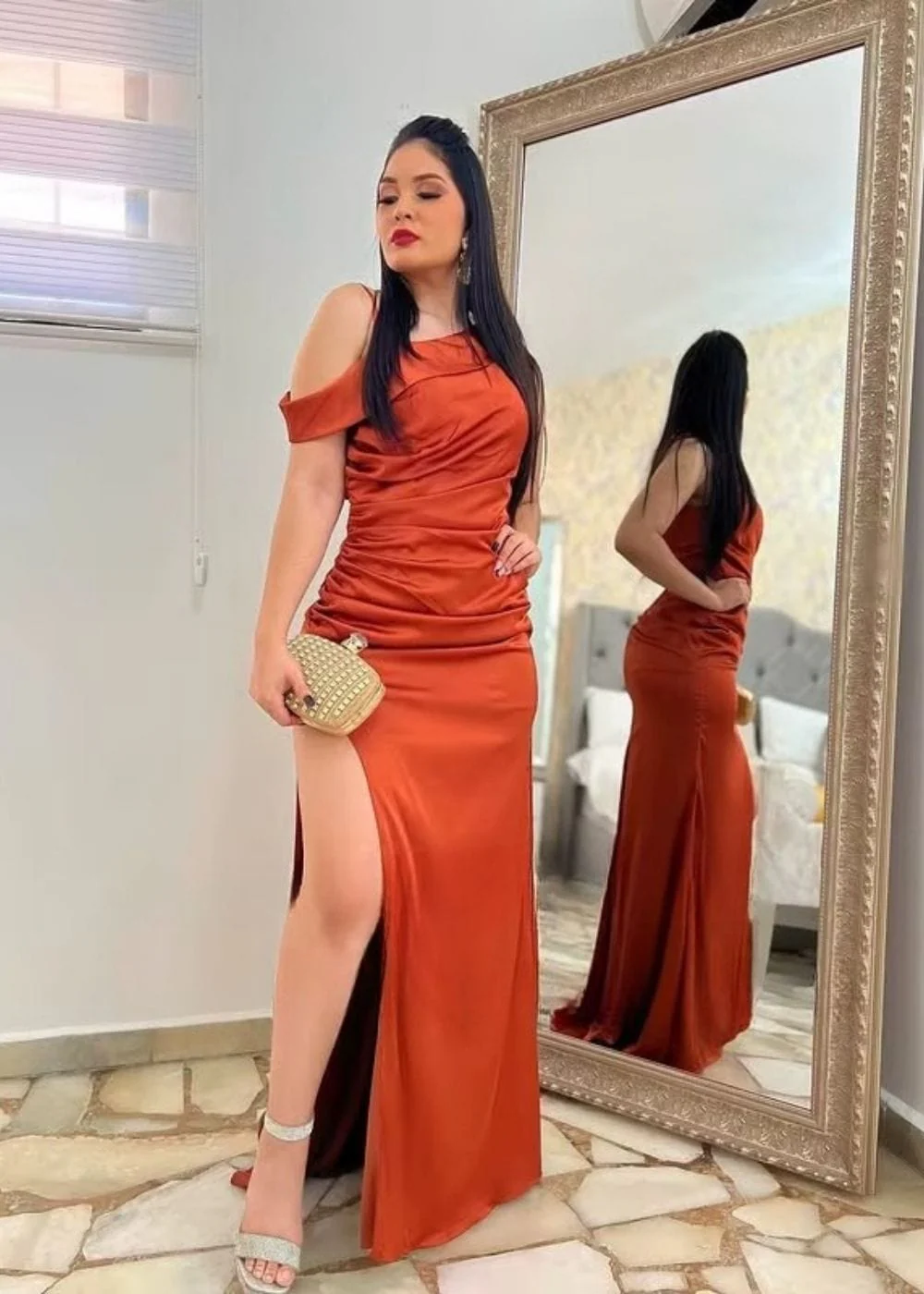 Cette robe de mariage terracotta évoque pleinement la féminité et le raffinement. Son encolure asymétrique met en valeur le port de tête, tandis que la fente haute sublime la jambe avec sensualité. Idéale pour un mariage ou une soirée chic, elle assure une allure du plus bel effet à chaque pas. Portée avec des sandales à talons et des accessoires scintillants, elle promet une présence inoubliable.