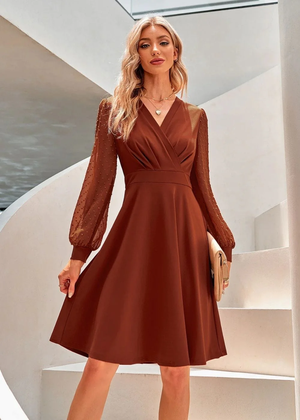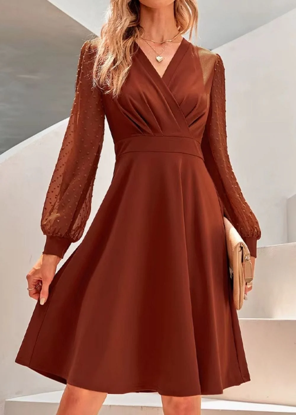 Craque pour cette sublime robe trapèze terracotta, un véritable symbole de féminité et d’élégance. Son tissu fluide épouse le mouvement avec grâce, tandis que sa taille marquée et son décolleté cache-cœur soulignent parfaitement ta silhouette. Les manches en tulle à pois ajoutent une touche de délicatesse et de romantisme, rendant cette pièce irrésistiblement raffinée. Que ce soit pour un événement chic ou une sortie spéciale, cette robe ne laisse personne indifférent et évoque pleinement l’élégance intemporelle.