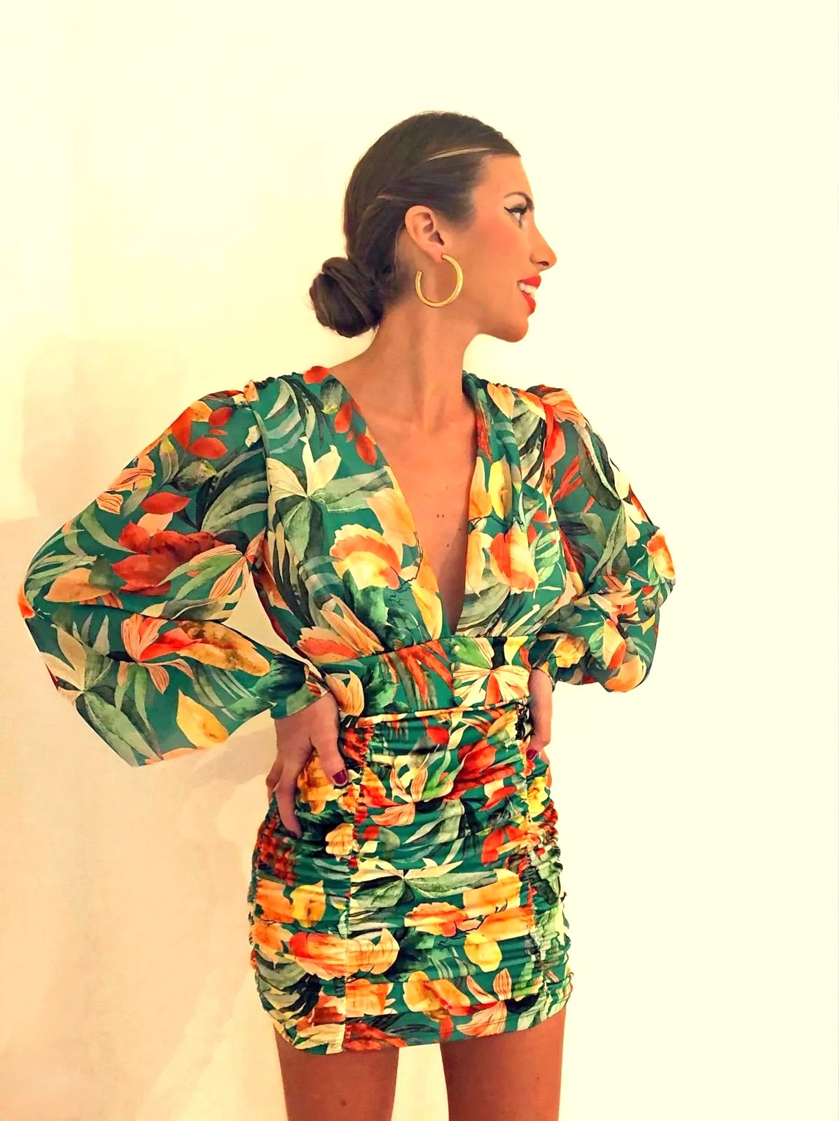 Livraison en 48h – Retours Gratuits Longueur environ 80 cmRobe verte à fleurs – Fabriqué en ItaliePartie basse froncée et élastique95% polyester, 5% élasthanne