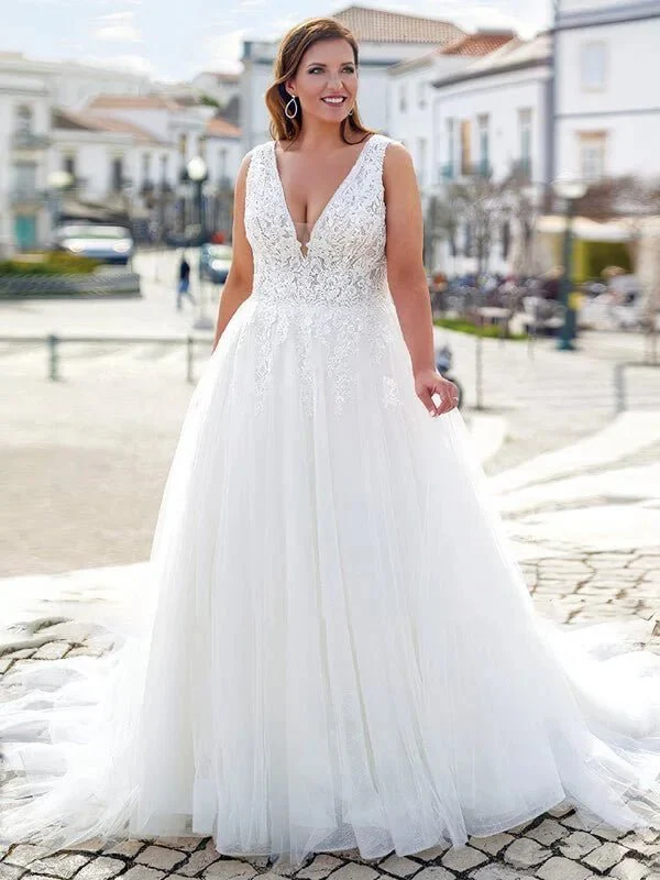 La robe de mariée trapèze est la silhouette parfaite pour les femmes rondes, car elle met en valeur votre taille tout en dissimulant vos hanches et vos cuisses. La longueur en balayage est parfaite pour un mariage en plein air ou sur la plage, vous permettant de marcher gracieusement dans le sable ou l’herbe sans vous soucier de vous prendre les pieds dans votre robe.