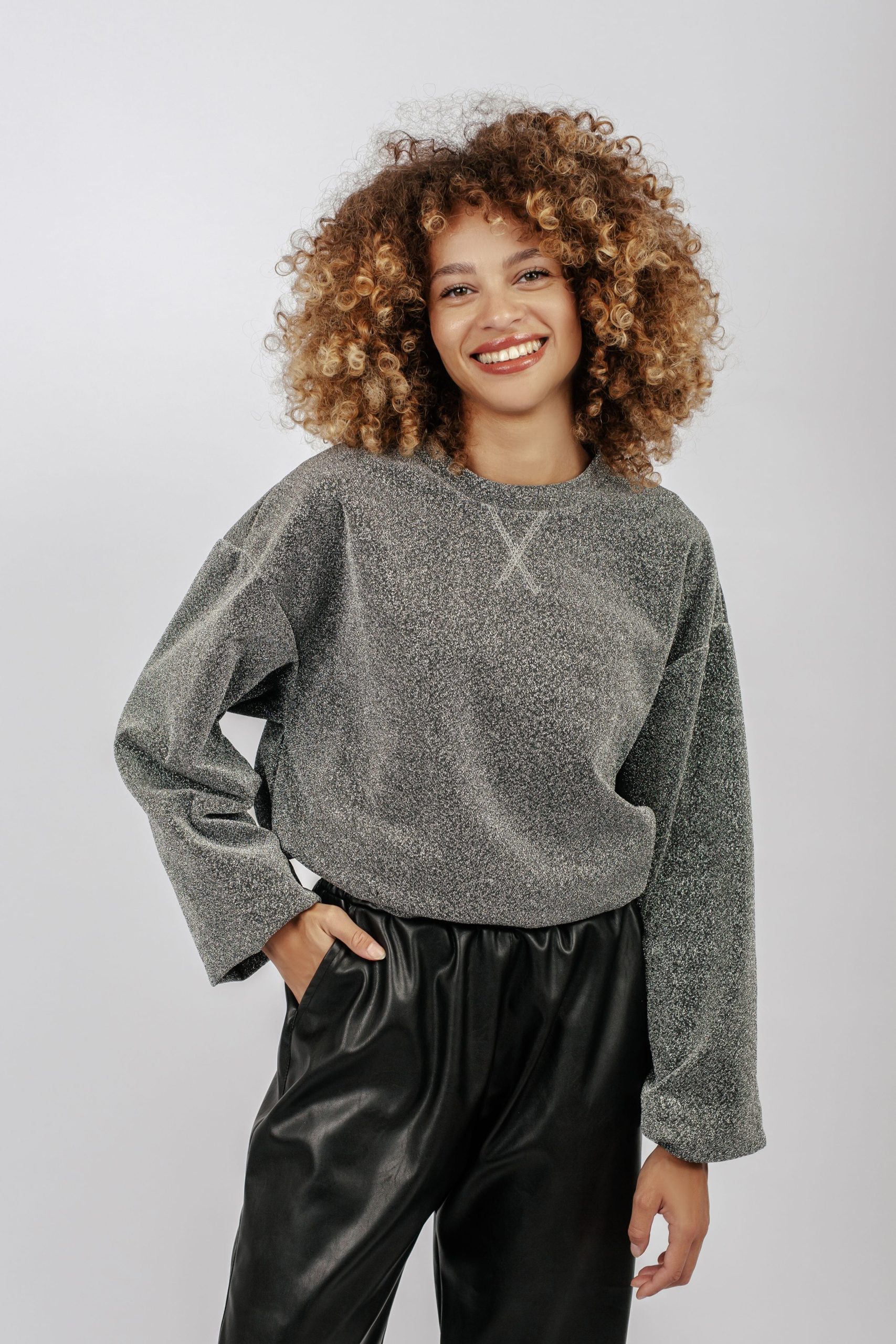 Plongez dans l’éclat et le confort avec notre sweat Ethere pailleté argenté, conçu pour celles qui veulent briller sans compromettre le confort. Sa coupe oversize vous enveloppe dans une ambiance décontractée et tendance, parfaite pour les journées décontractées ou les soirées animées. Le col rond classique ajoute une note de simplicité élégante, tandis que les poignets élastiques apportent une touche moderne à l’ensemble. Ce sweat pailleté vous assure un style qui se démarque sans effort. Faites une déclaration audacieuse et scintillante avec notre sweat argenté, la pièce incontournable pour celles qui aiment briller avec confiance.