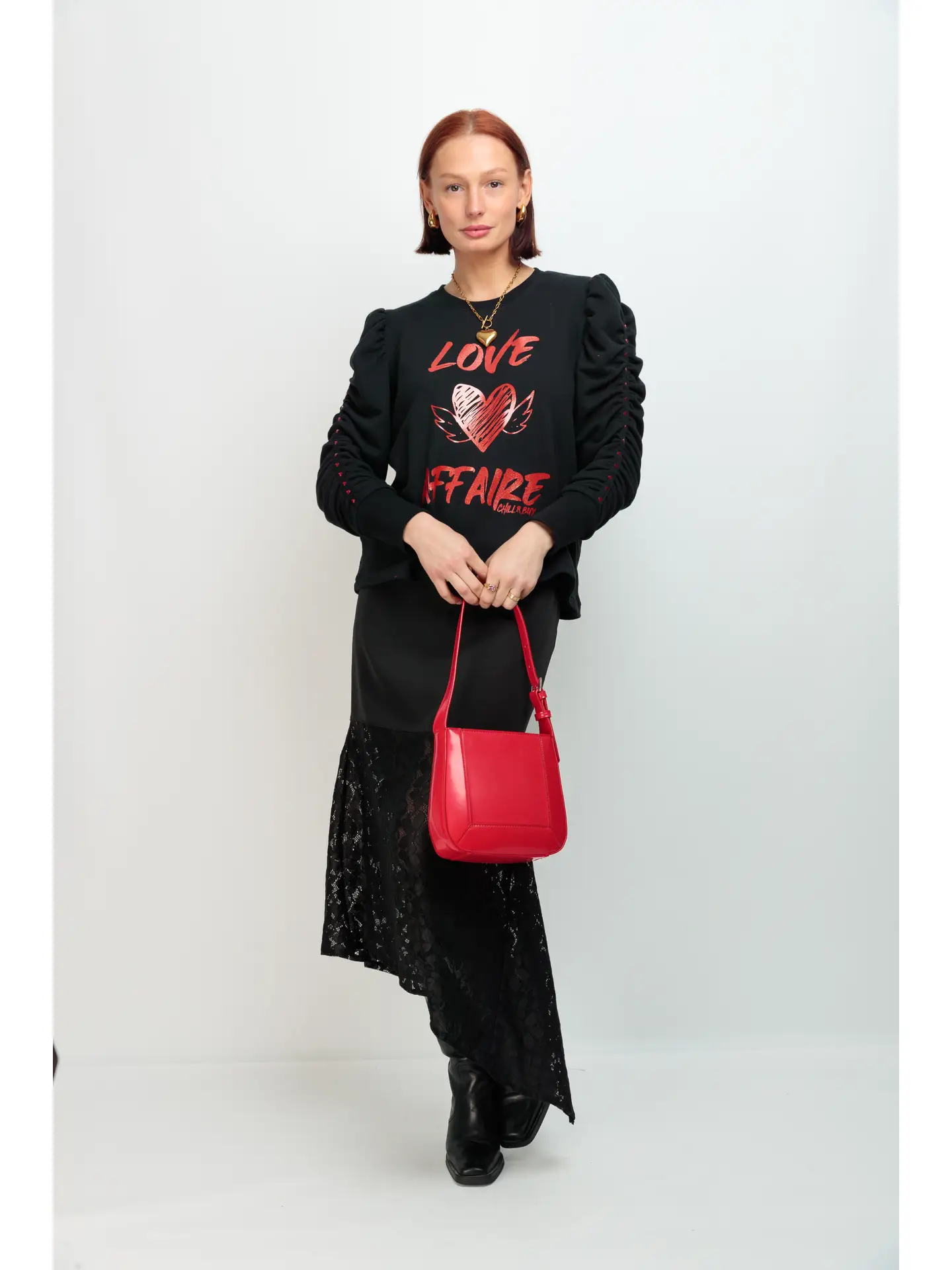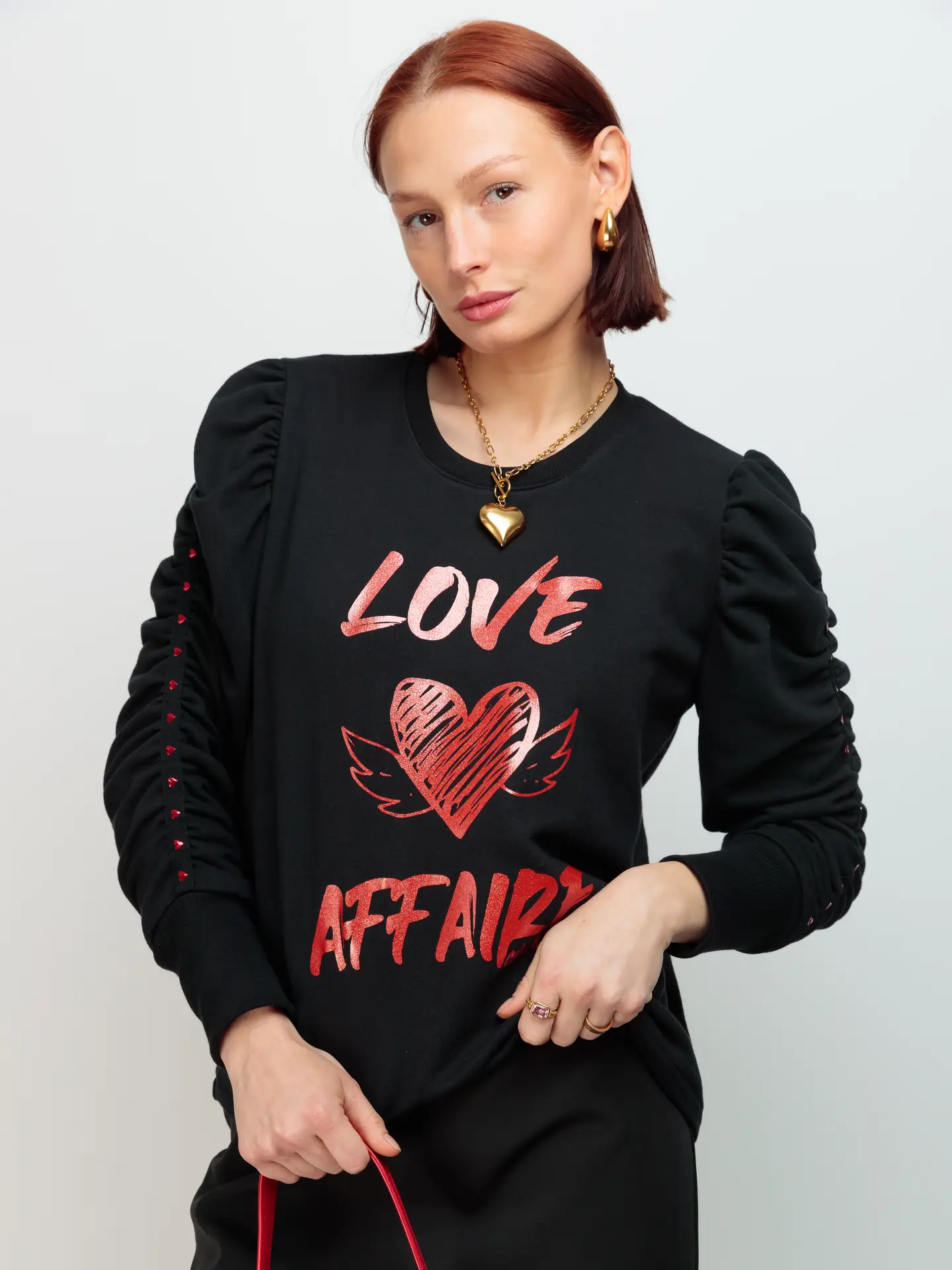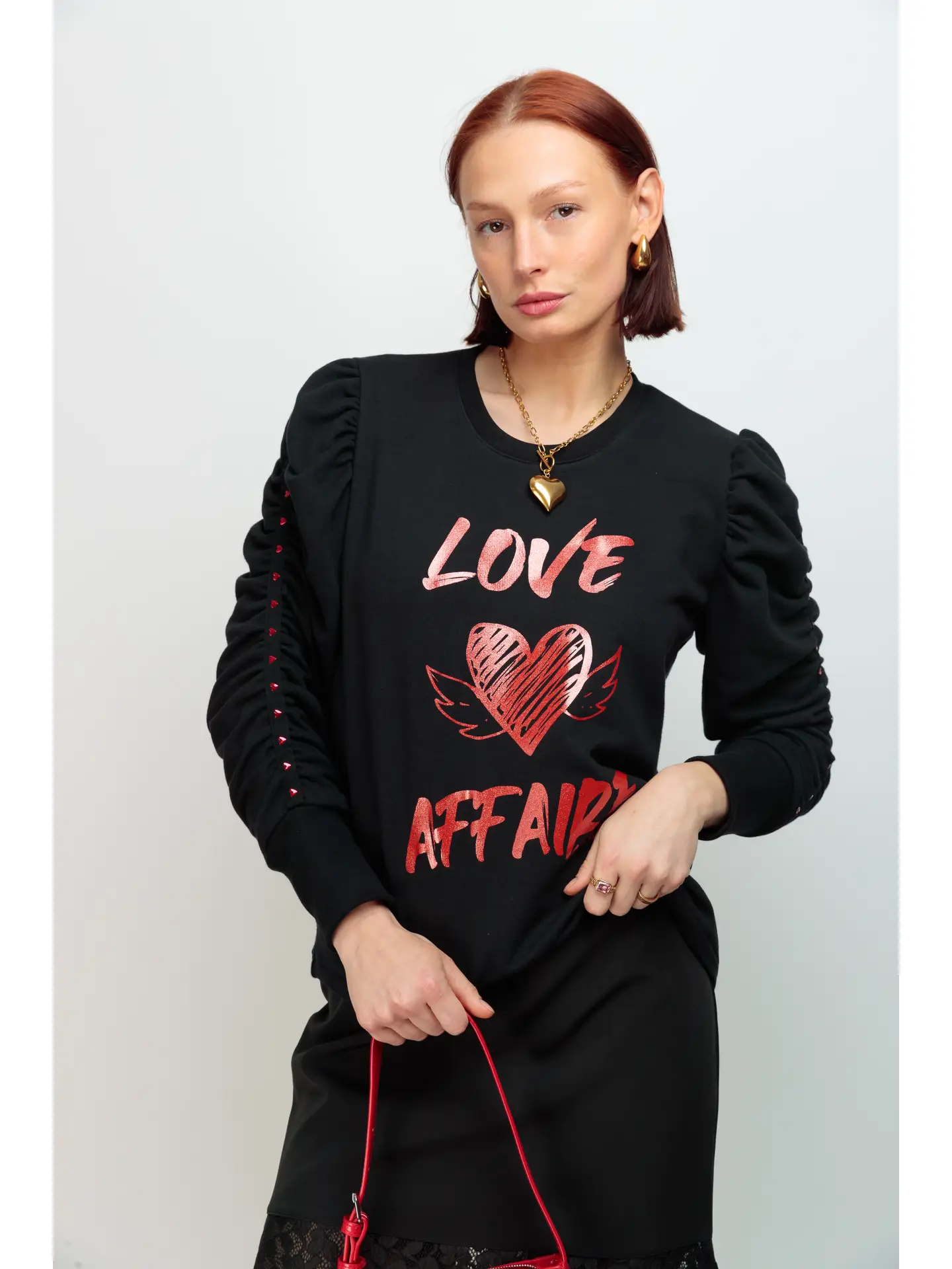 🔹 Détails marquants : impression frontale en paillettes rouges « LOVE AFFAIRE », manches bouffantes ornées de clous métalliques rouges en forme de cœur, col rond intemporel