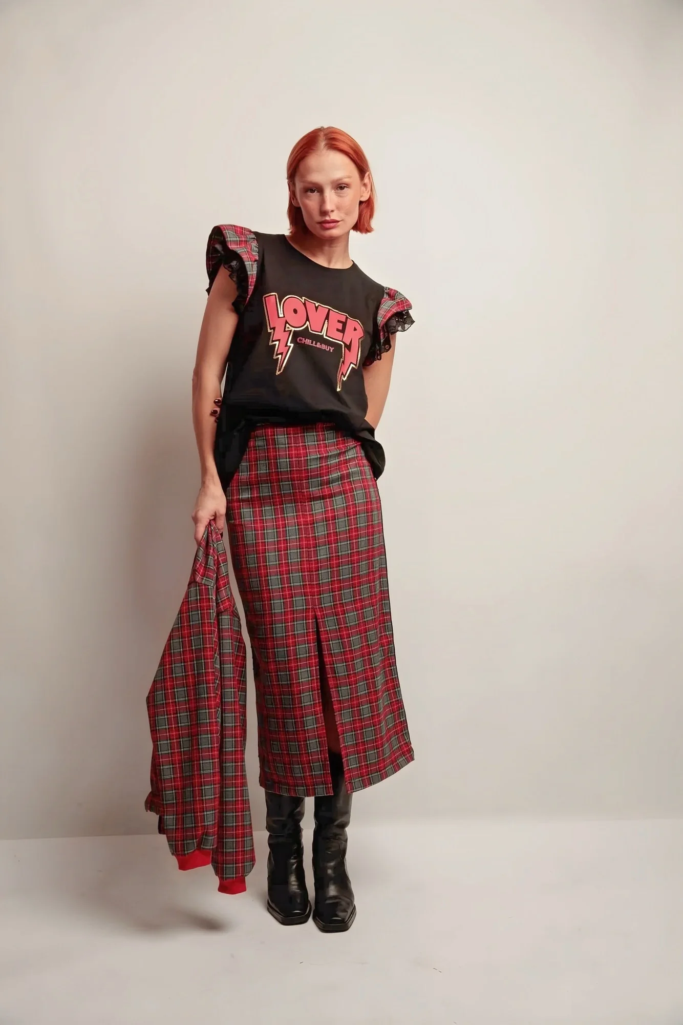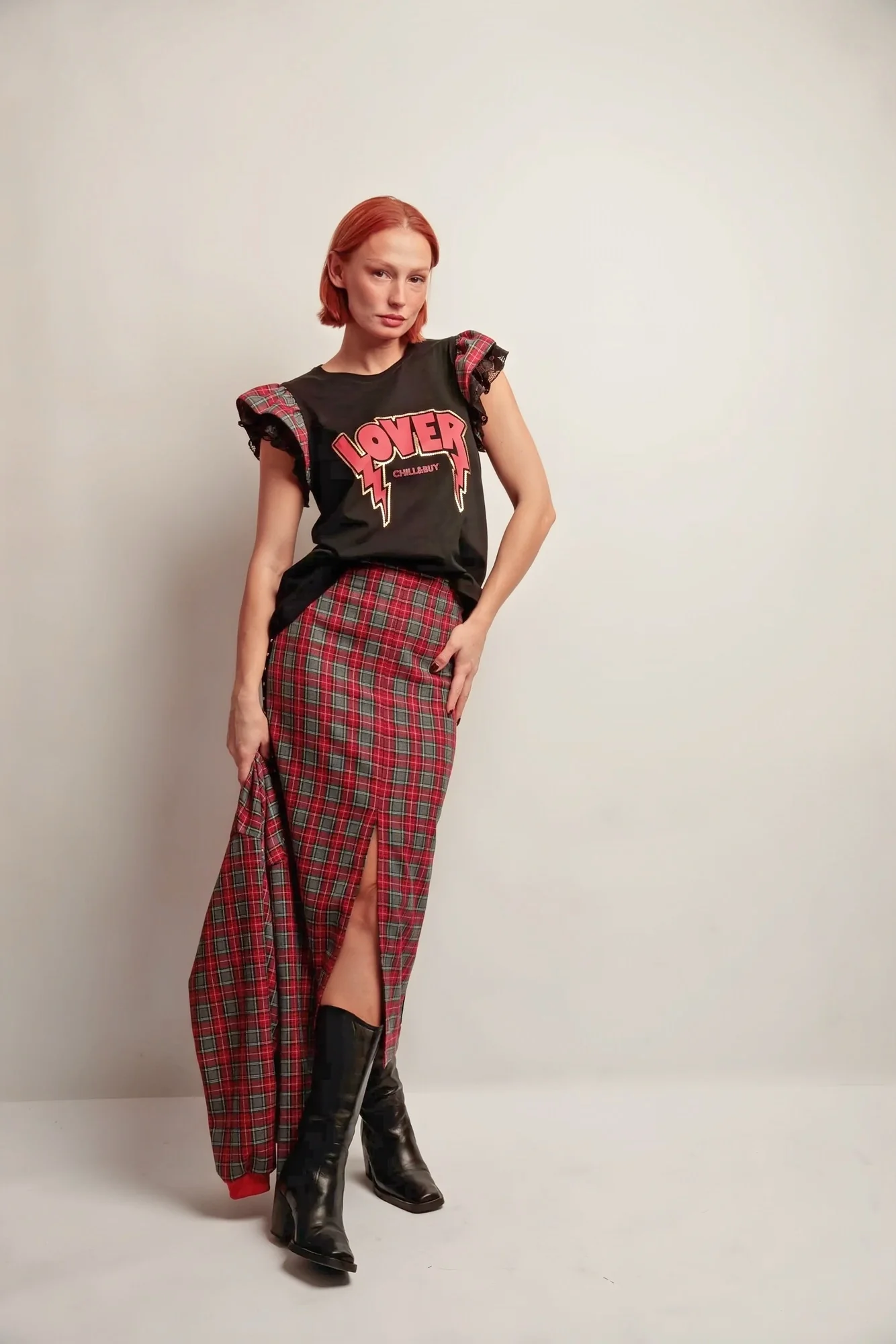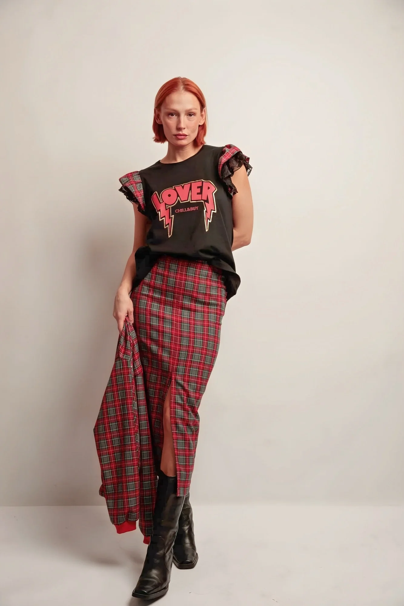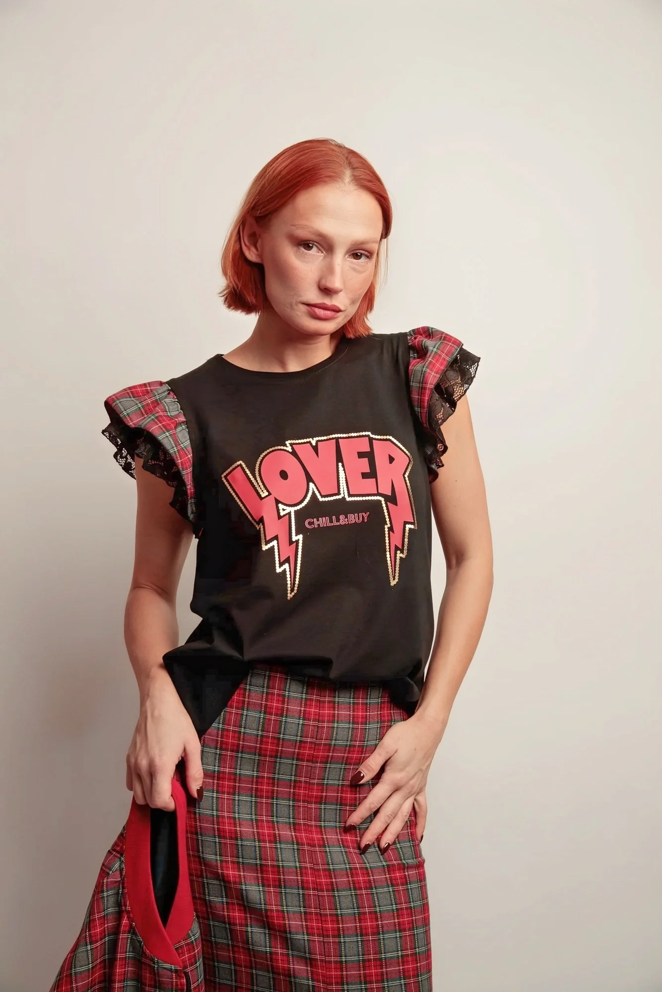 🔹 Détails marquants : Volants bicolores sur les emmanchures combinant tissu tartan et dentelle, imprimé « LOVER » contrasté sur le devant