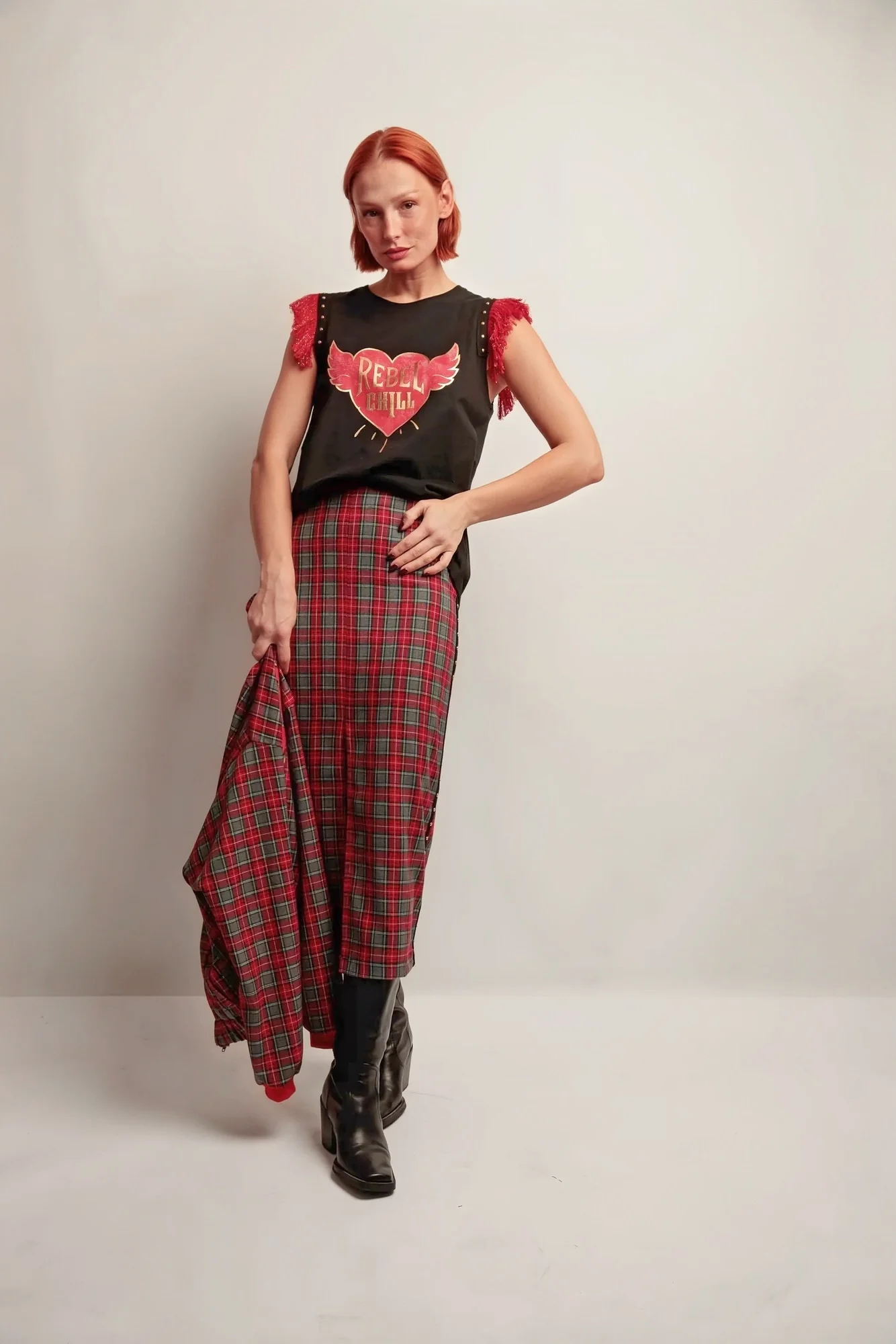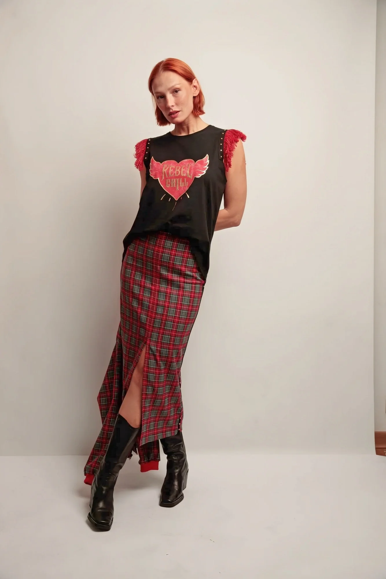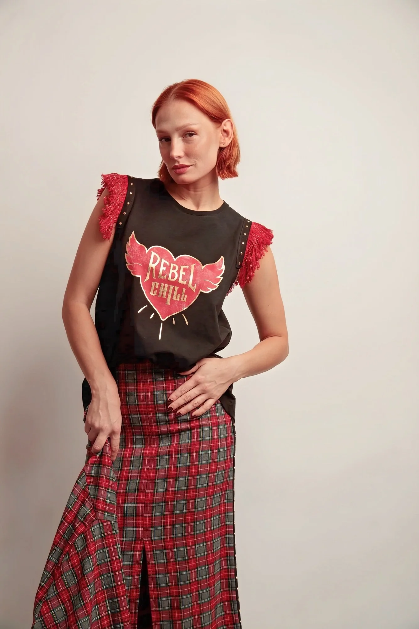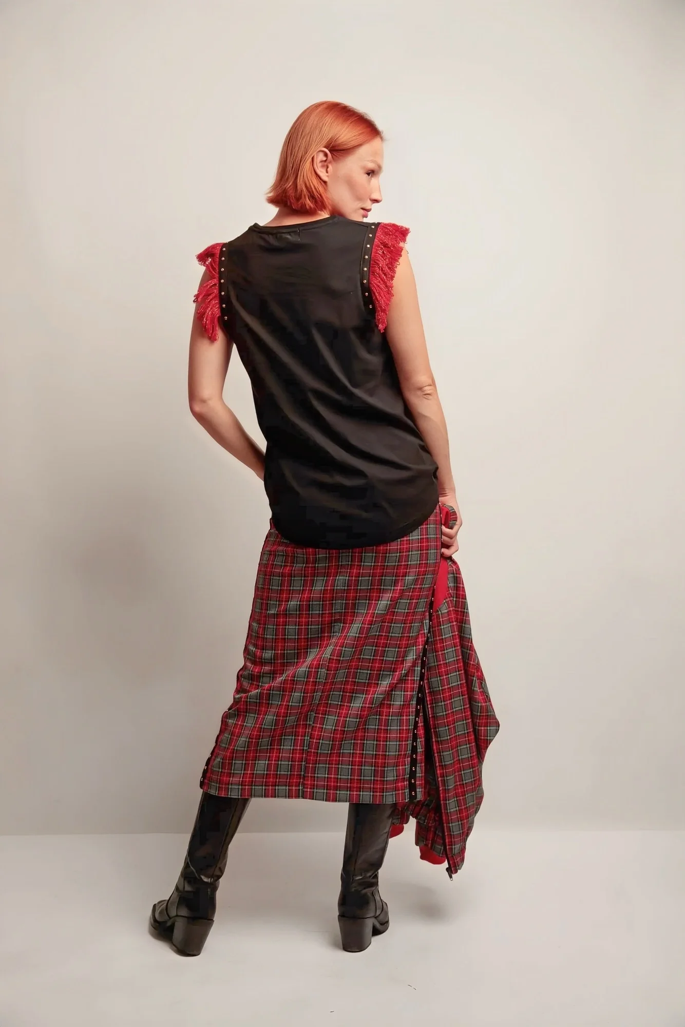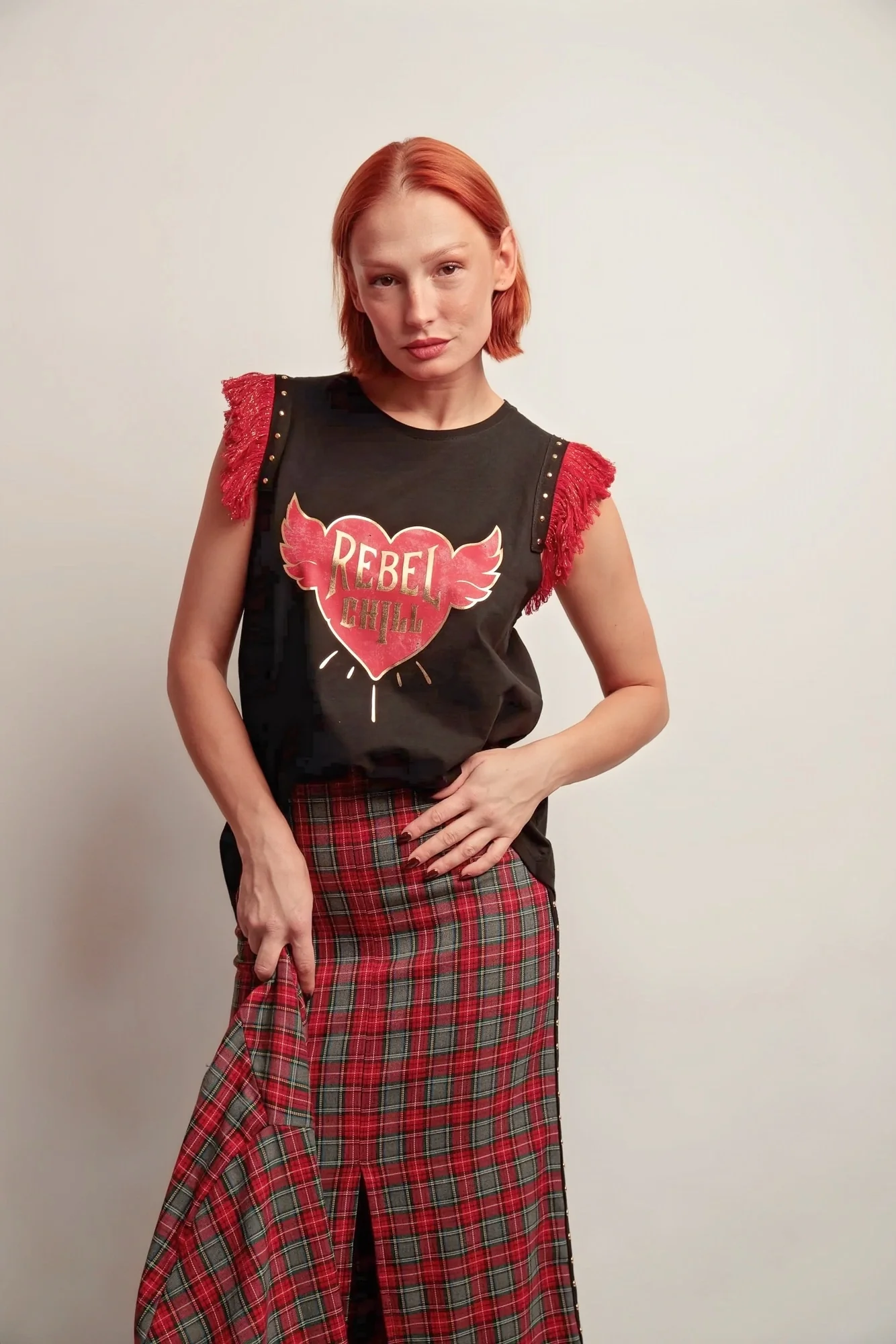🔹 Détails marquants : Franges en lurex rouge aux emmanchures, finies par une bande de clous dorés, imprimé frontal contrasté