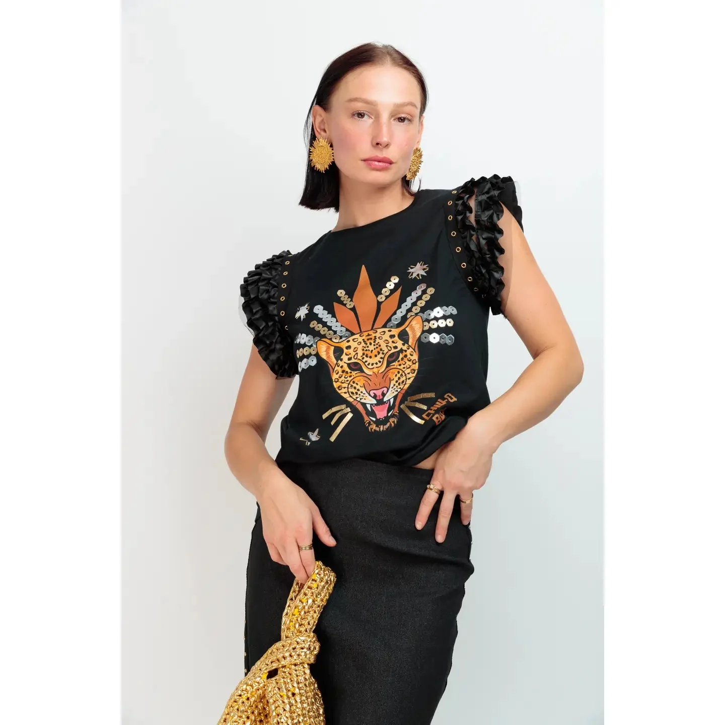 Le motif leopard imprimé sur le devant confère à ce t-shirt une allure moderne et affirmée. Symbole de force et de confiance, cet imprimé donne du caractère à votre tenue tout en restant harmonieux avec le design des manches. Son style artistique apporte une note tendance et originale, parfait pour celles qui aiment se démarquer avec subtilité.