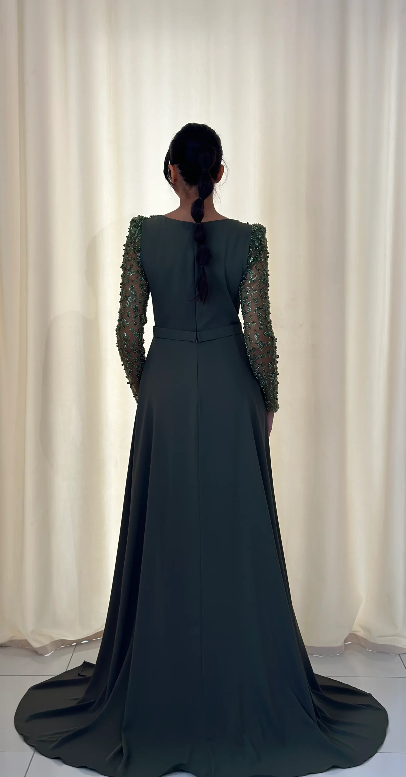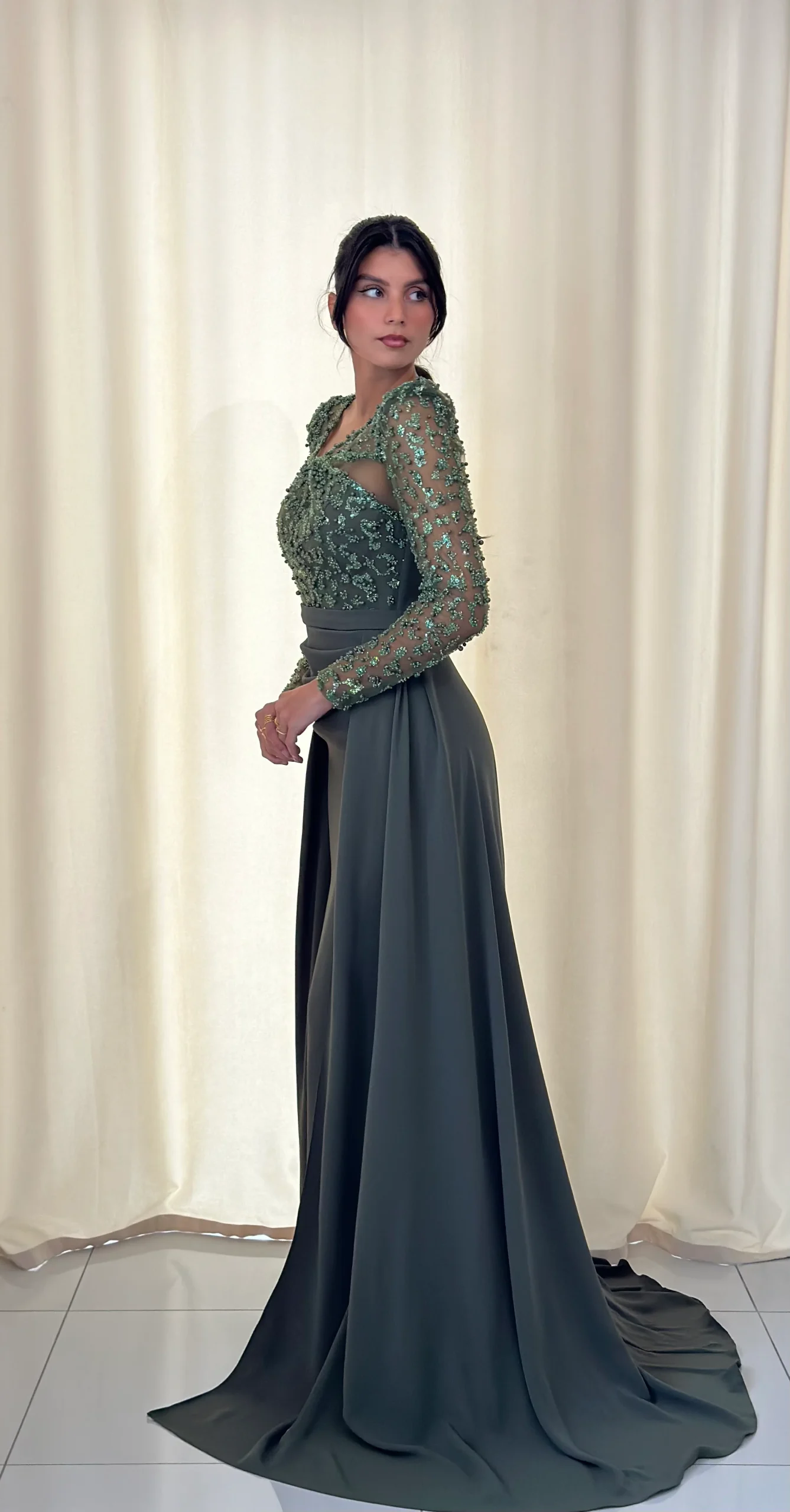 En outre, les finitions soignées et les détails élégants témoignent d’une qualité exceptionnelle. Ainsi, que vous souhaitiez briller lors d’une réception ou simplement séduire par votre prestance, cette robe de soirée kaki est une pièce incontournable.
