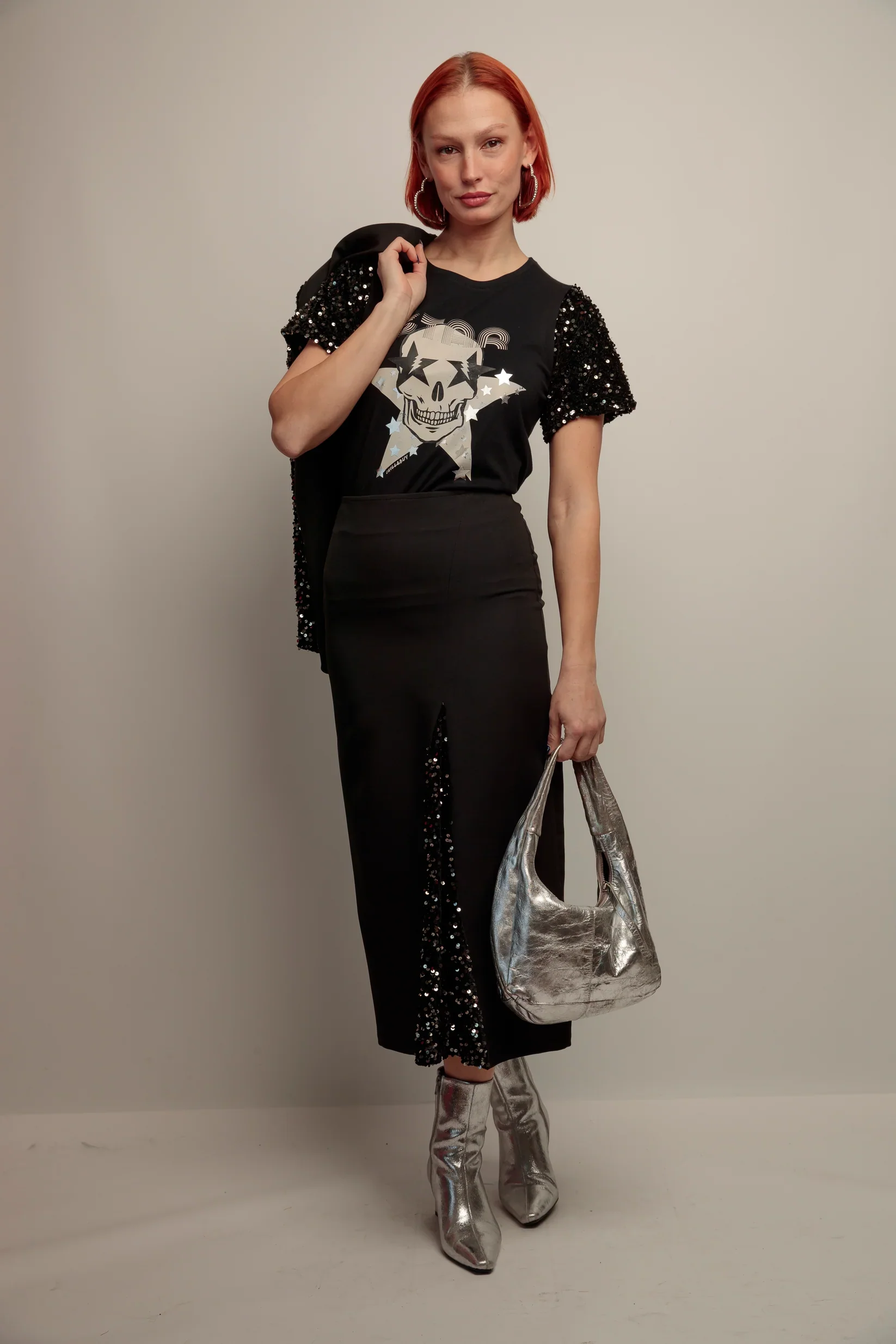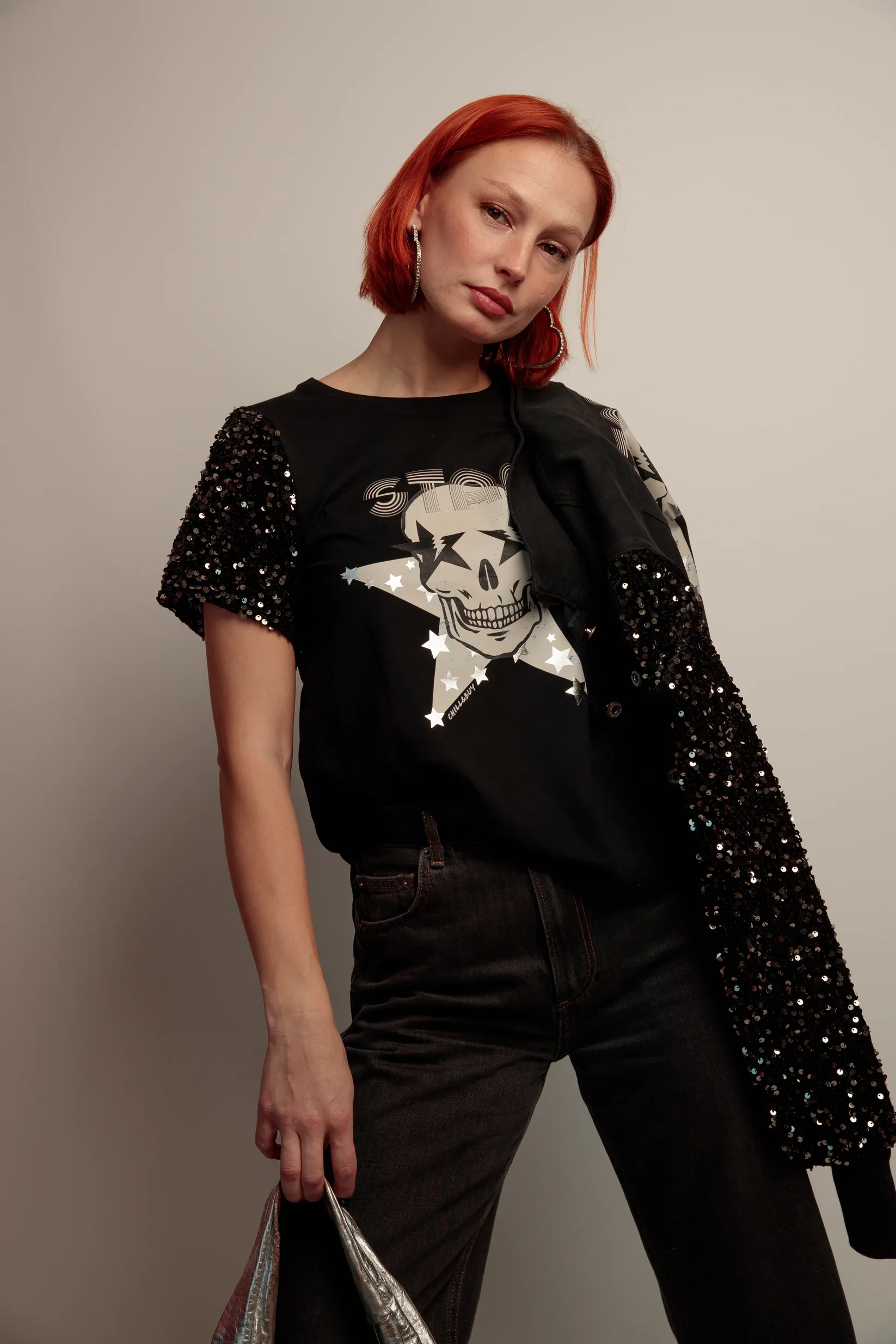 Détails marquants : motif skull frontal rehausse de touches argentees, manches pailletees