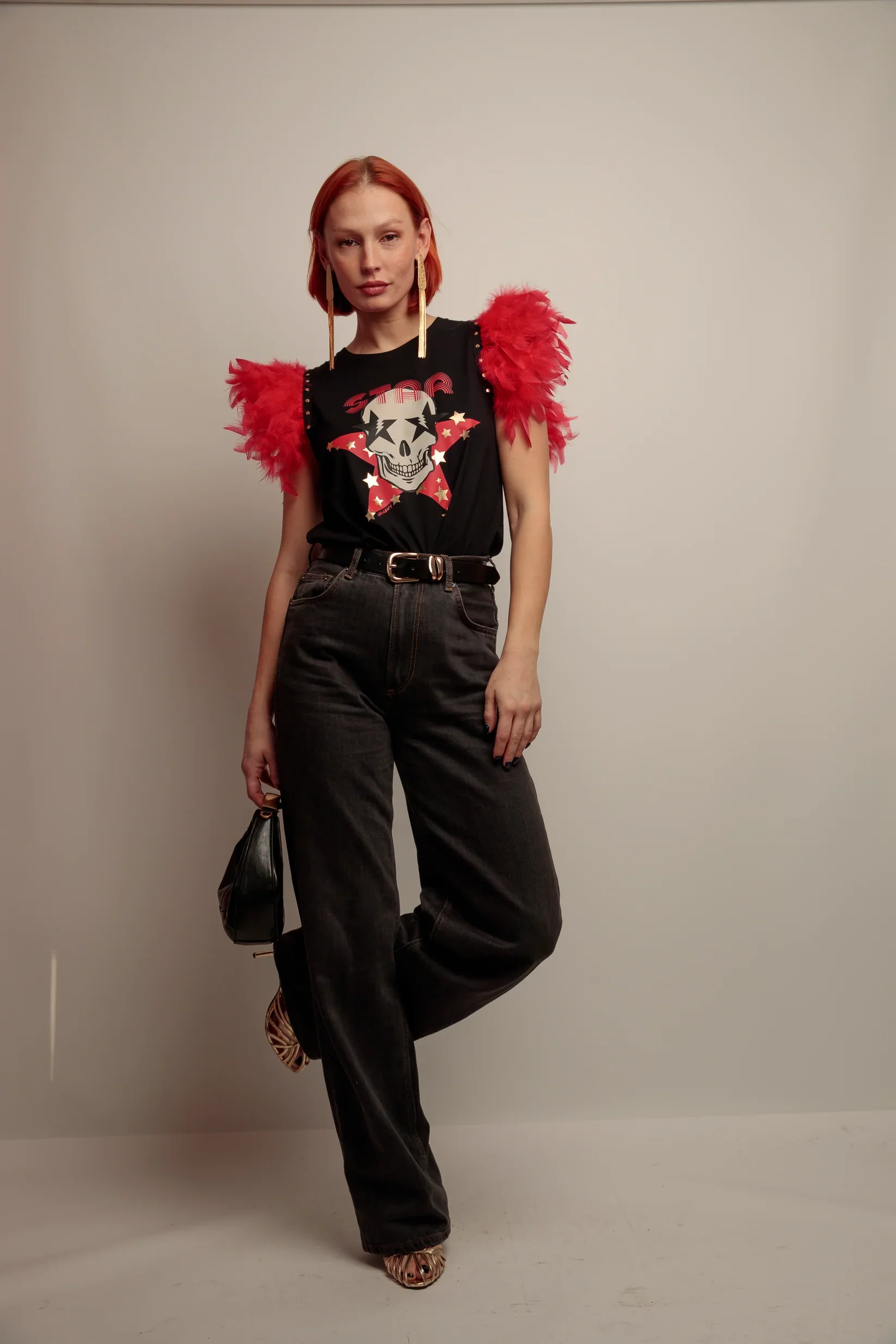 Tee-shirt à plumes rouge skull fiesta Une piece expressive qui associe coton doux, coupe evasee et jeux de textures sur l’epaule. Les plumes rouges structurees par une bande de taches dorees apportent un relief unique, tandis que le bas asymetrique assure un tombé fluide. Coupe / Forme : coupe evasee, bas asymetrique, col rond Matiere […]