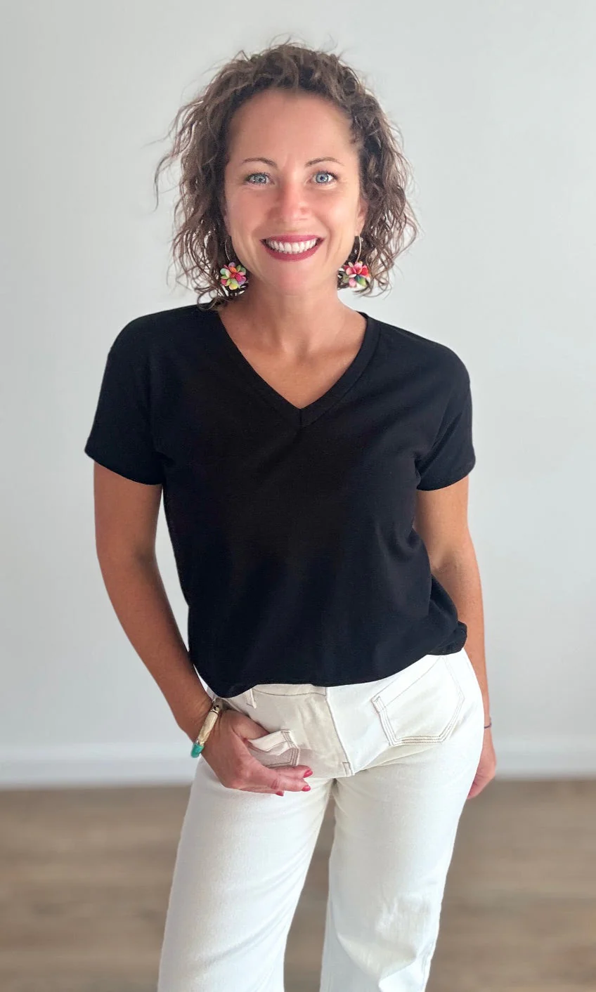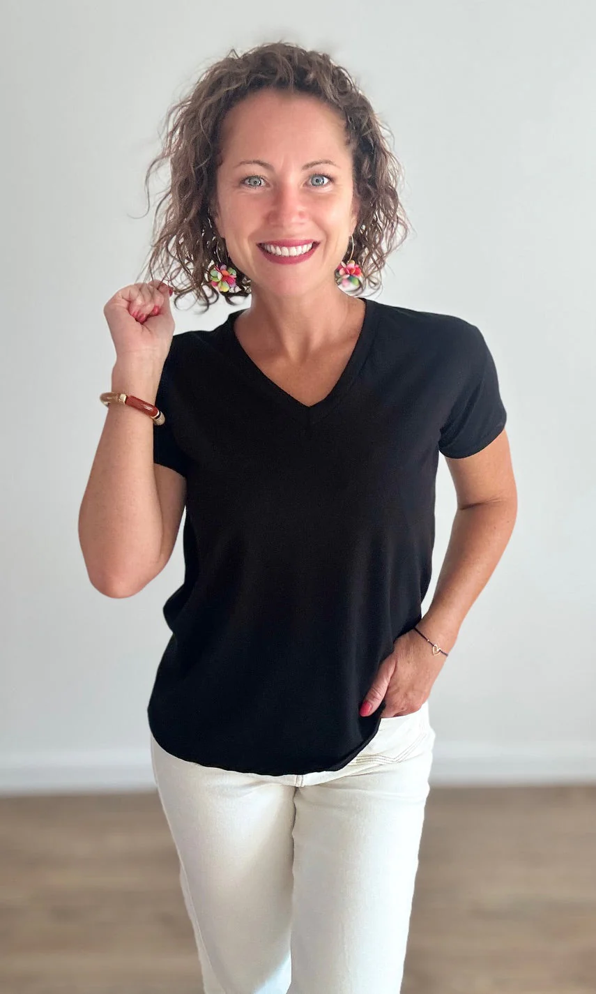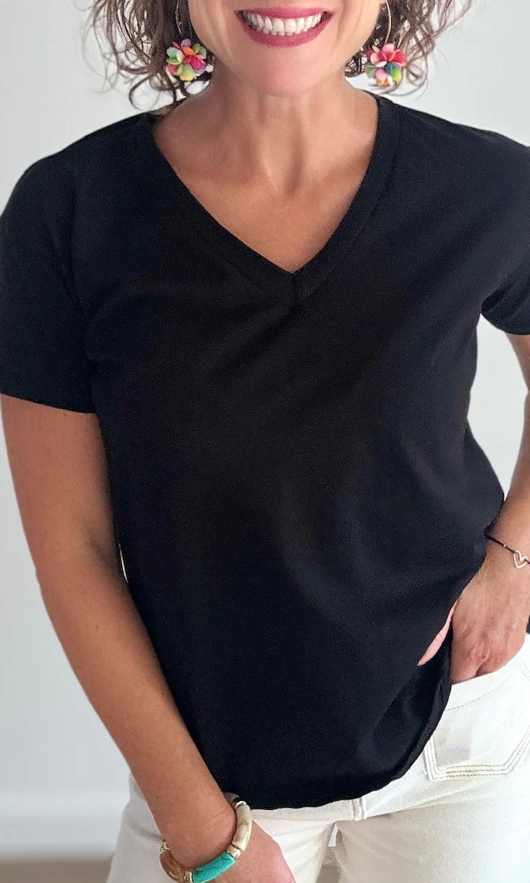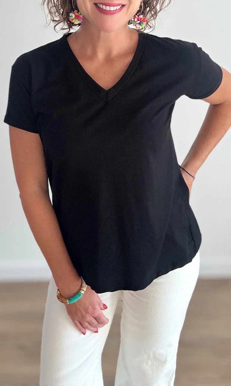 Ce t-shirt noir à col V court est un incontournable chic et décontracté, parfait pour apporter une touche de féminité subtile à toutes vos tenues. Sa coupe courte et son col V délicatement ouvert offrent une allure moderne et élégante, tandis que la matière douce vous assure un confort optimal au quotidien.