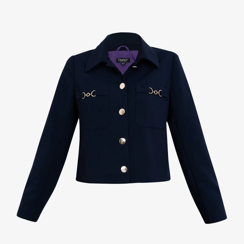 Confectionnée dans un tissu souple, elle se distingue par ses boutons et ses bijoux métalliques raffinés