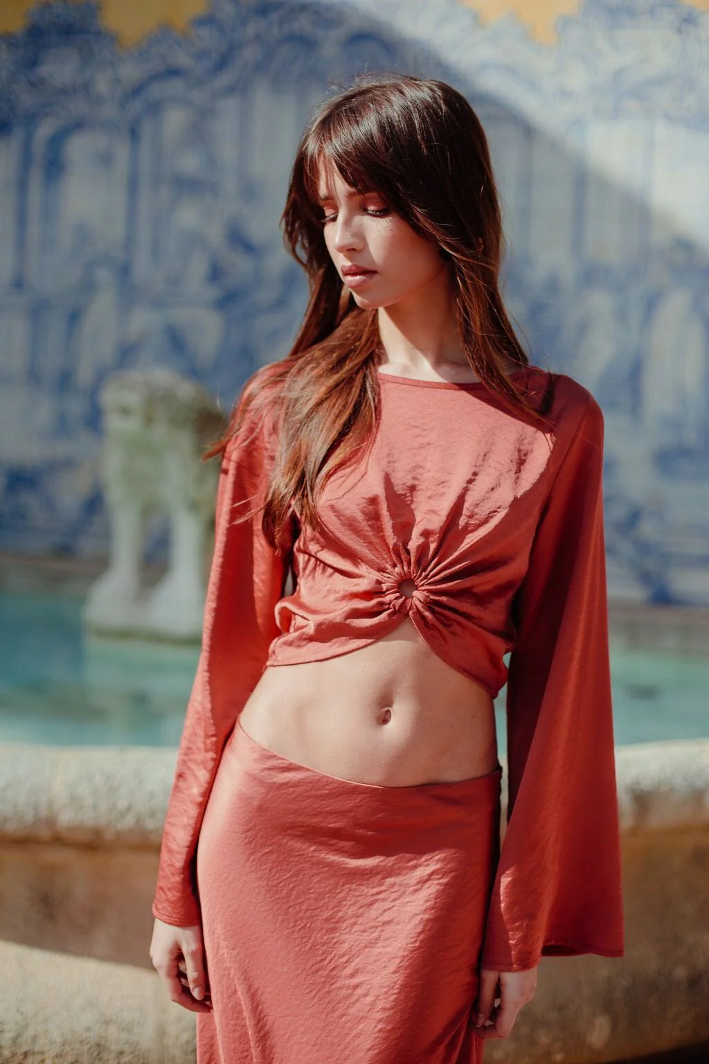 Le Top Allure se distingue par son élégance naturelle et sa teinte terracotta captivante. Confectionné dans un tissu satiné luxueux, ce top court offre une silhouette raffinée avec ses manches longues pagode et son col bateau délicat. Un détail d’anneau unique sur le devant ajoute une touche contemporaine, tandis que le lien à nouer dans le haut du dos permet un ajustement personnalisé et révèle un décolleté rond séduisant dans le dos. Parfait pour ajouter une note d’élégance à vos tenues, le Top Allure est une pièce incontournable pour celles qui cherchent à allier sophistication et modernité.