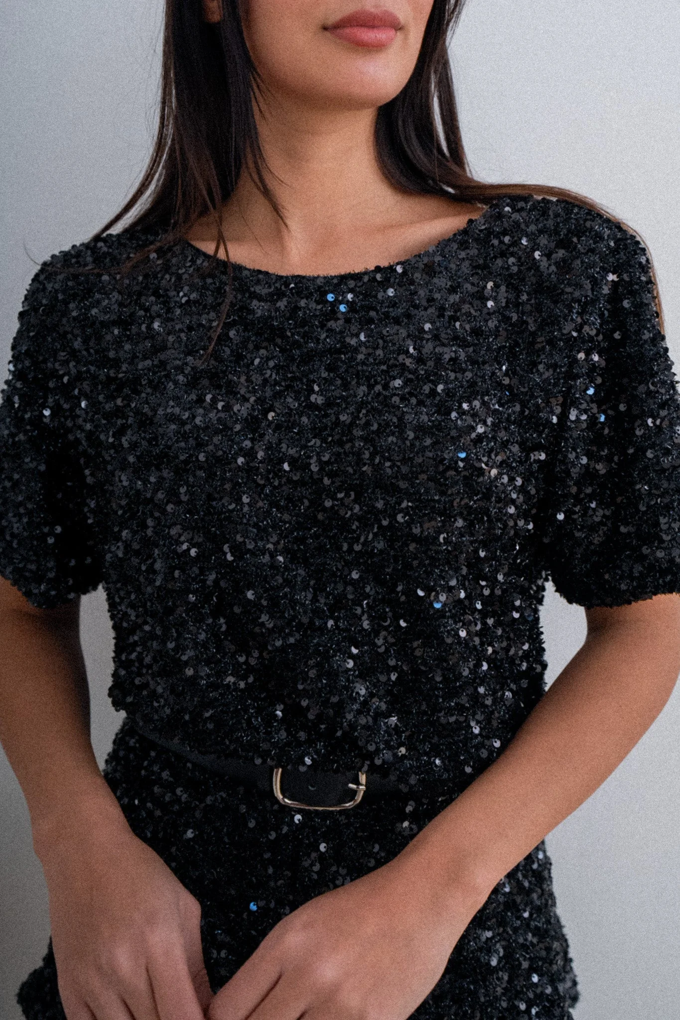 Top à manches courtes Encolure ronde Mélange paillettes et sequins Mesures à plat en CM : Carrure / Epaule : SM 39 ML 42 Poitrine : SM 51 ML 51 Longueur depuis épaule : SM 55 ML 57 La mannequin mesure 169cm et porte une taille SM