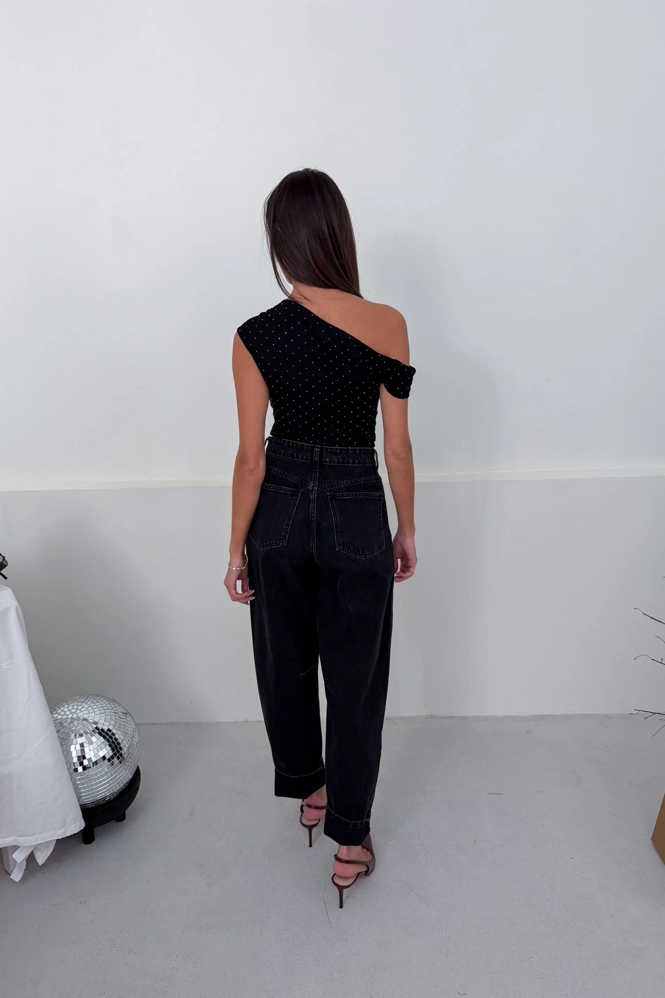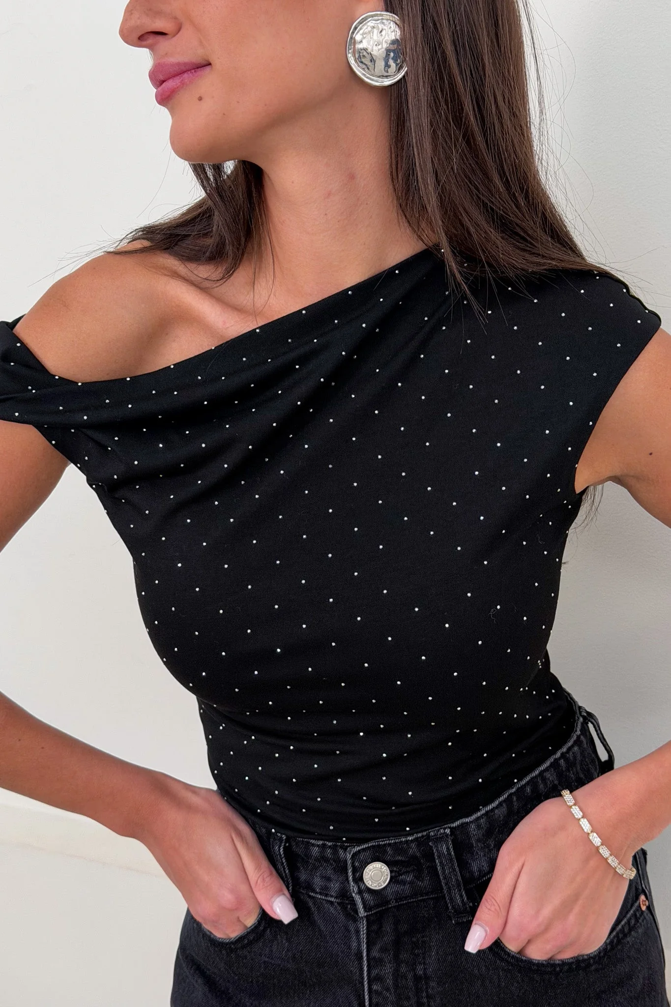 Top asymétrique sans manche Strass Mesures à plat en CM : Carrure / Epaule : S 38 M 39 L 40 Poitrine : S 38 M 40 L 42 Longueur : S 53 M 54 L 55 La mannequin mesure 173cm et porte une taille S.