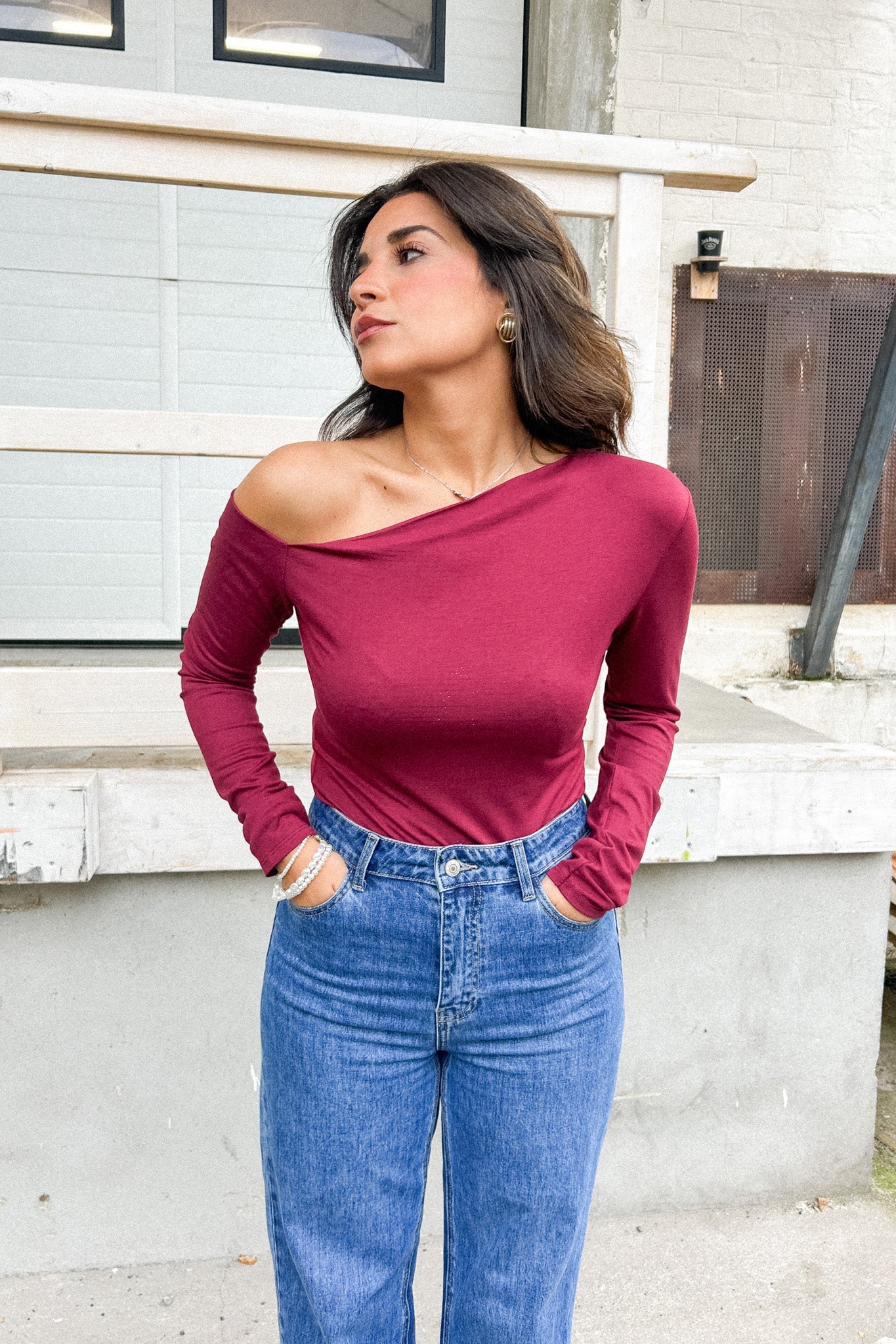Top manches longues asymétrique Epaule dénudée Mesures à plat en CM : Poitrine: S 38 M 40 L 41 Longueur depuis épaule : S 48 M 50 L 51 La mannequin mesure 172cm et porte une taille M