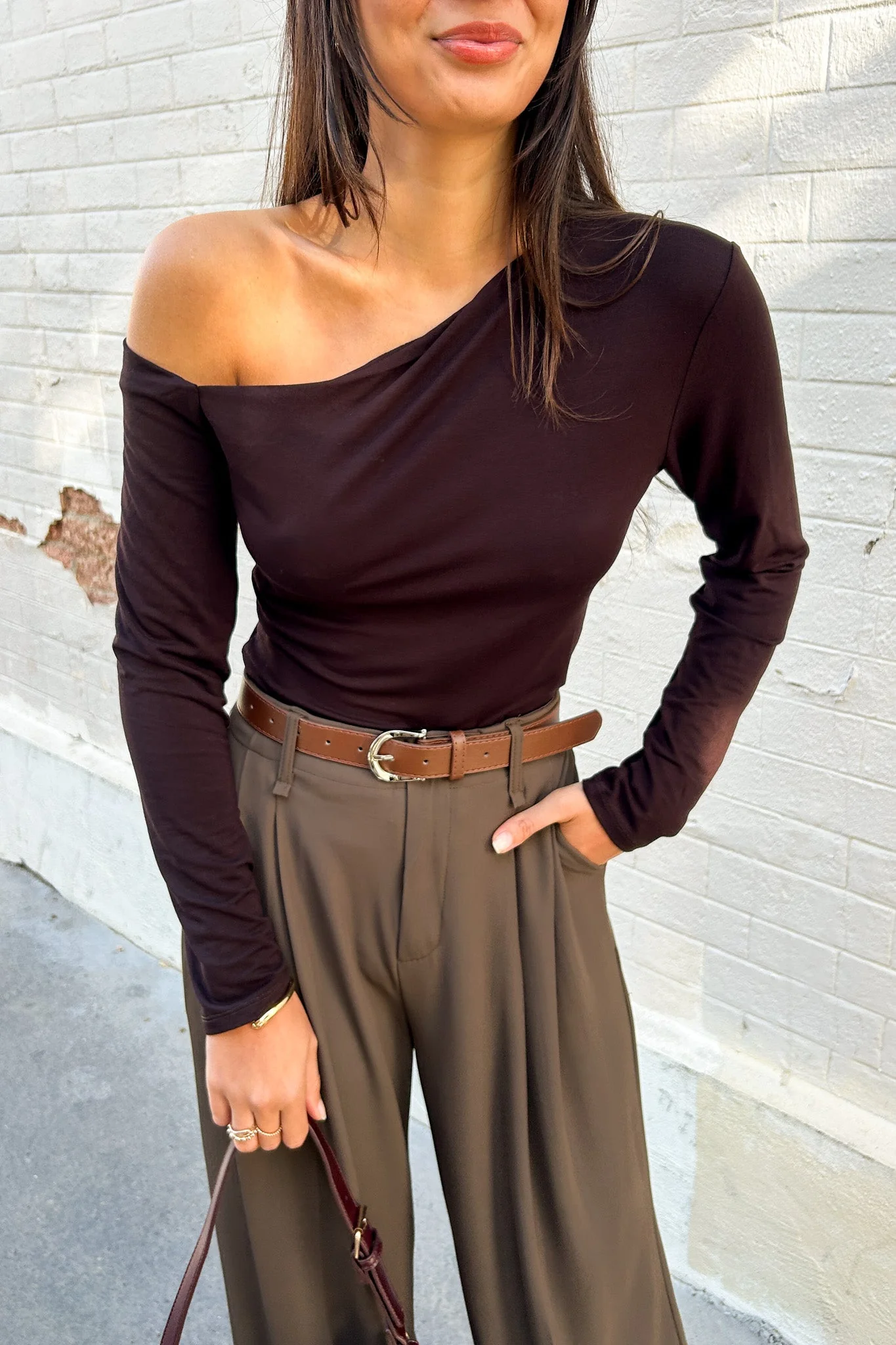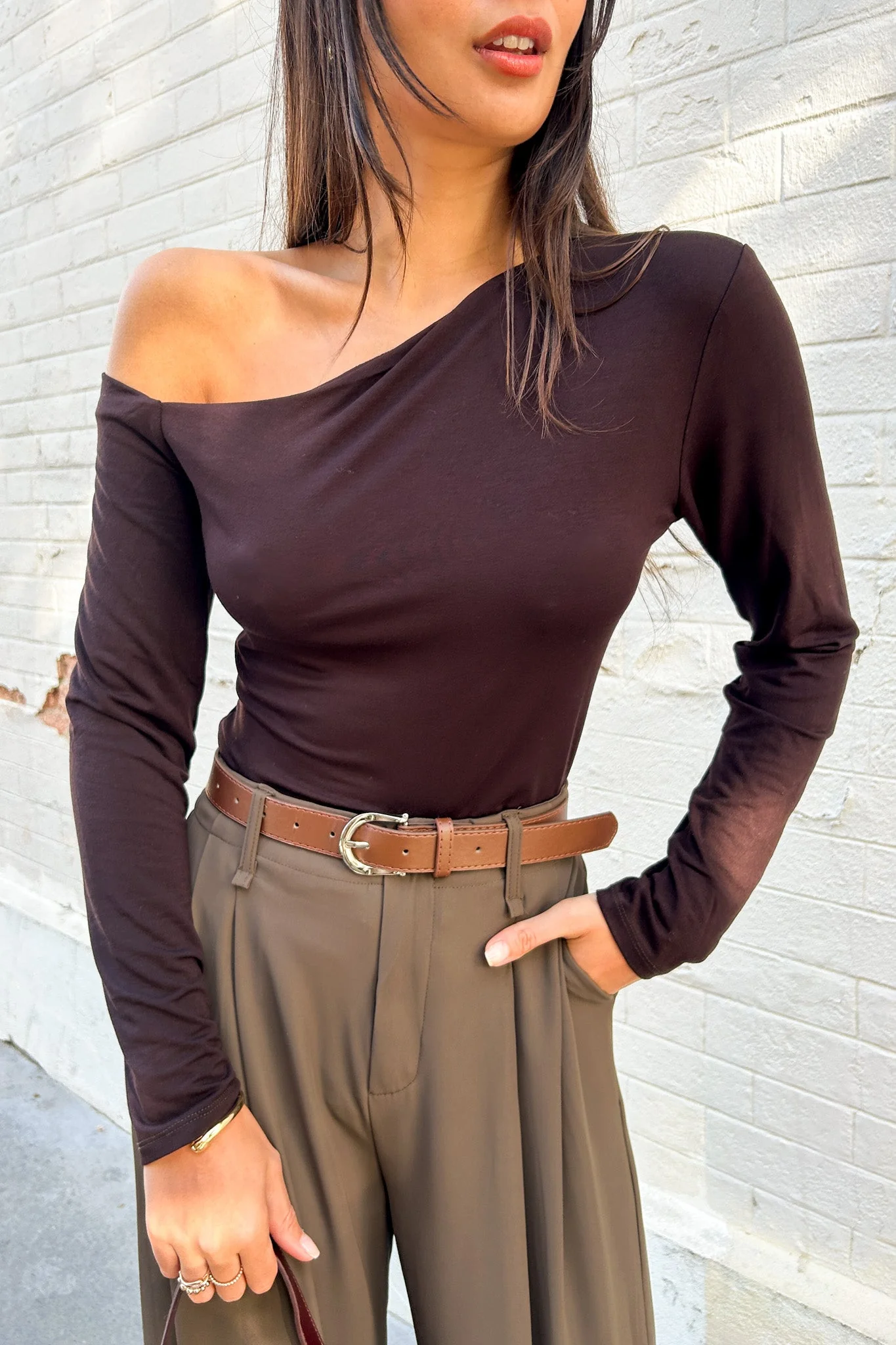 Top manches longues asymétrique Epaule dénudée Mesures à plat en CM : Poitrine: S 38 M 40 L 41 Longueur depuis épaule : S 48 M 50 L 51 La mannequin mesure 172cm et porte une taille S