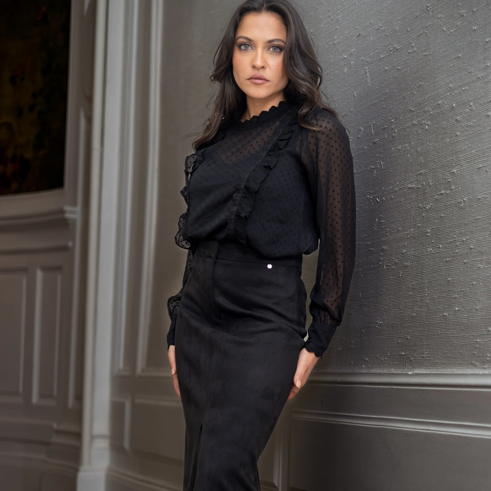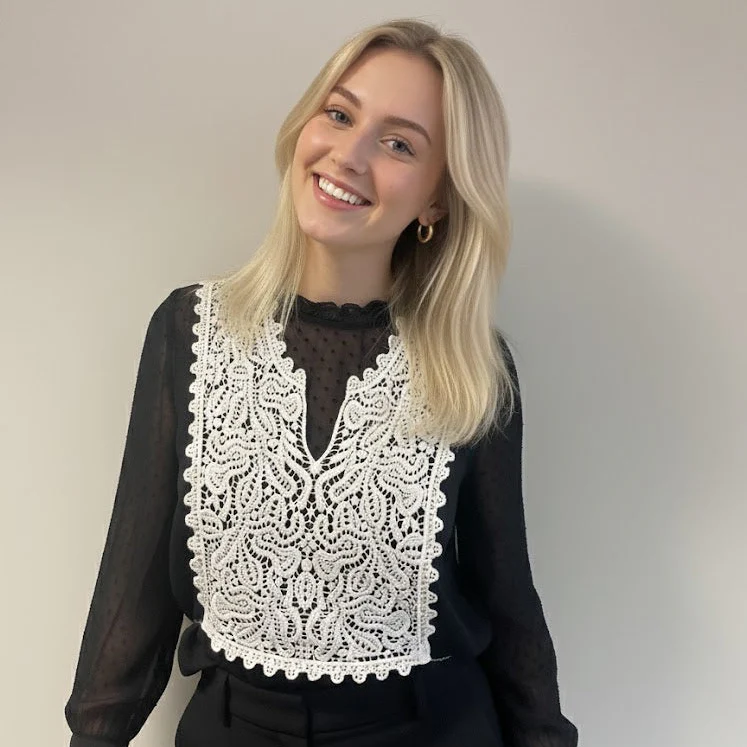 Manches longues légèrement froncées, ajoutant du volume et de la fluidité, terminées par des poignets élégants : 3 boutons gravés coloris argent et un galon en broderie anglaise.