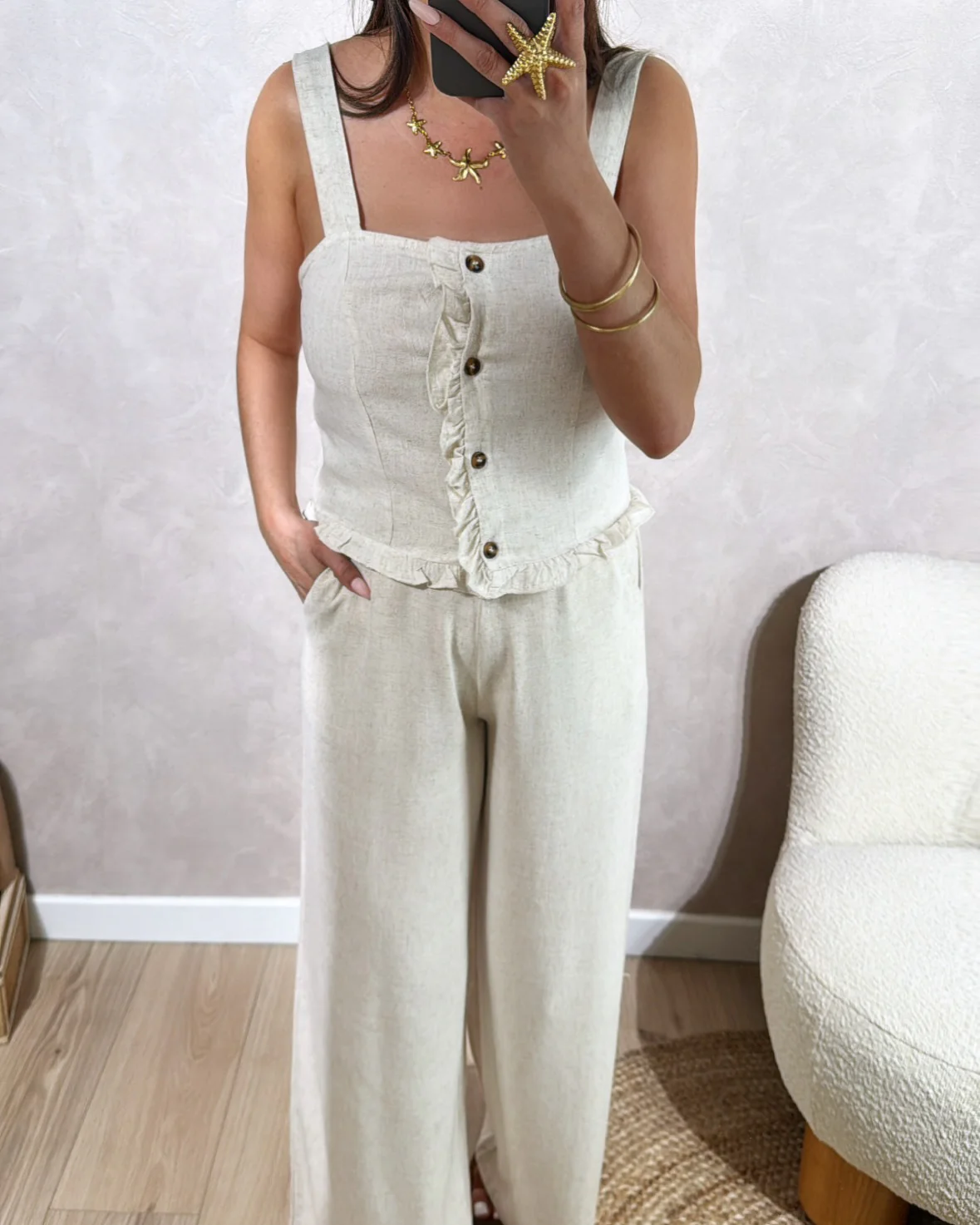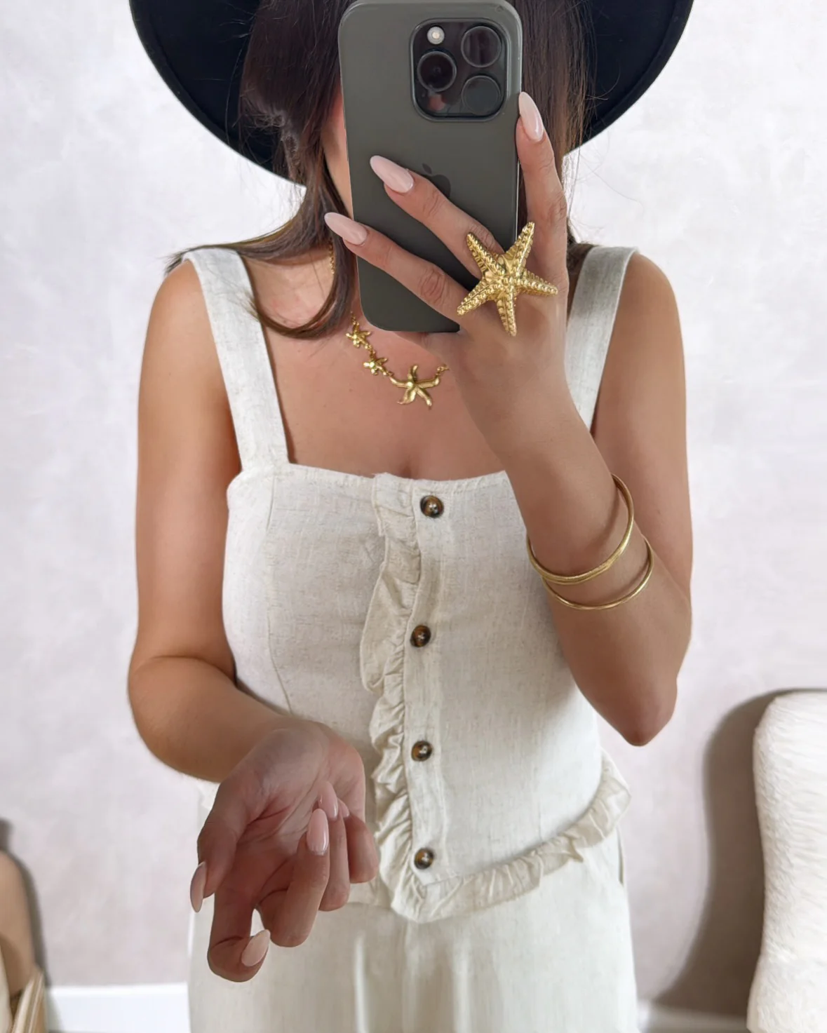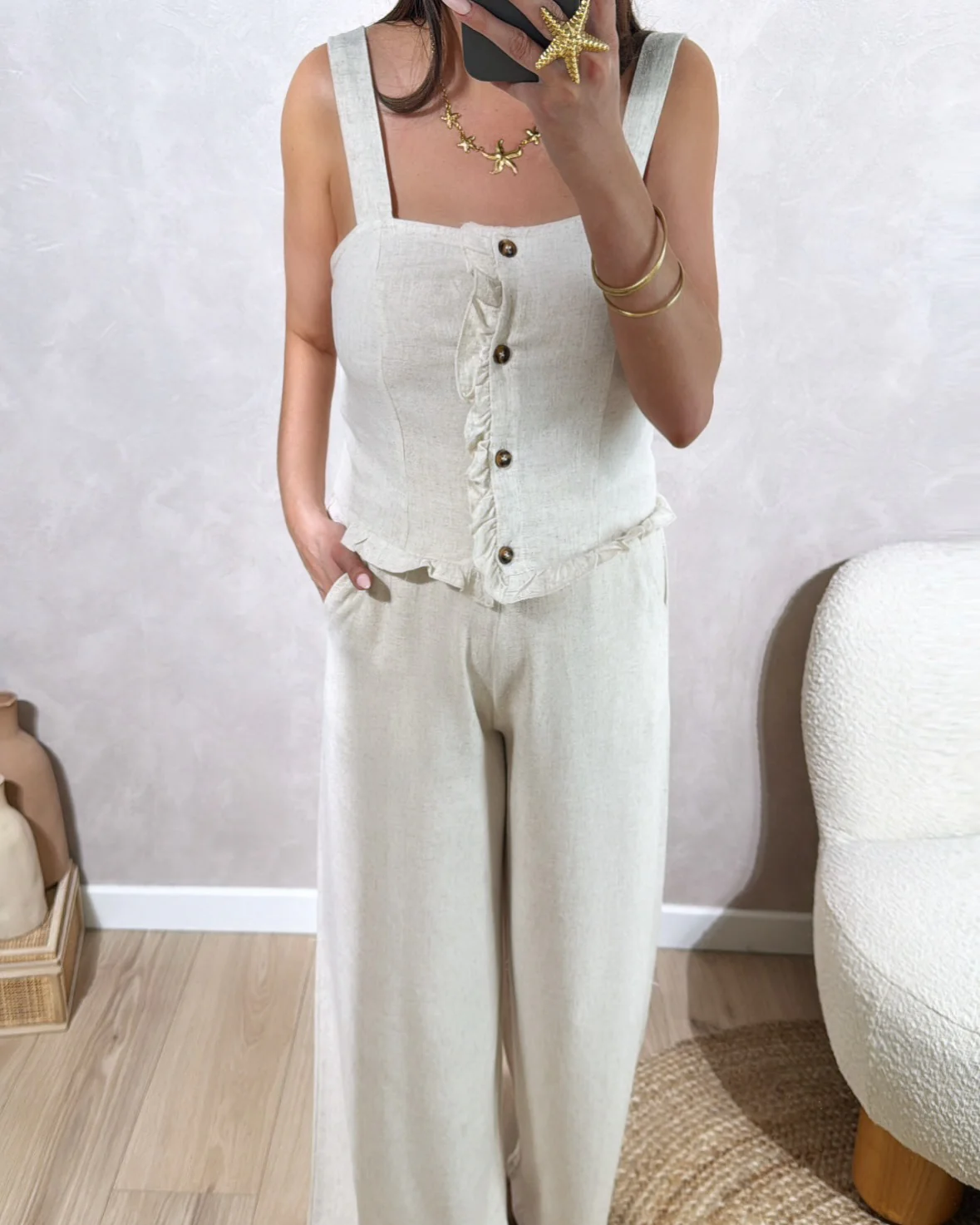 Top Luzia • Fermeture avec boutons sur le devant • Sans manches / débardeur • Volant devant et en bas • Le modèle mesure 1m65 et porte une SM • Composition : 70% Viscose 30% Lin • Mode d’expédition: La poste, colissimo sans signature . • Frais de port offerts à partir de 69 € […]