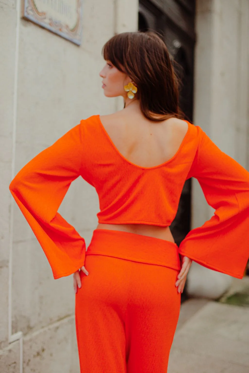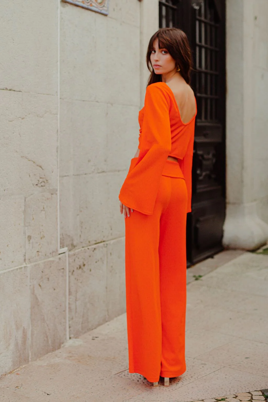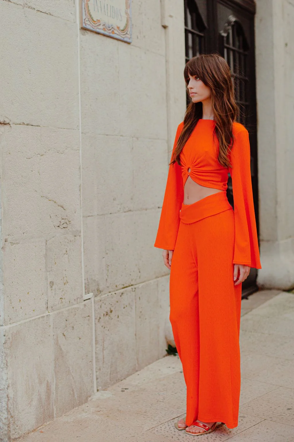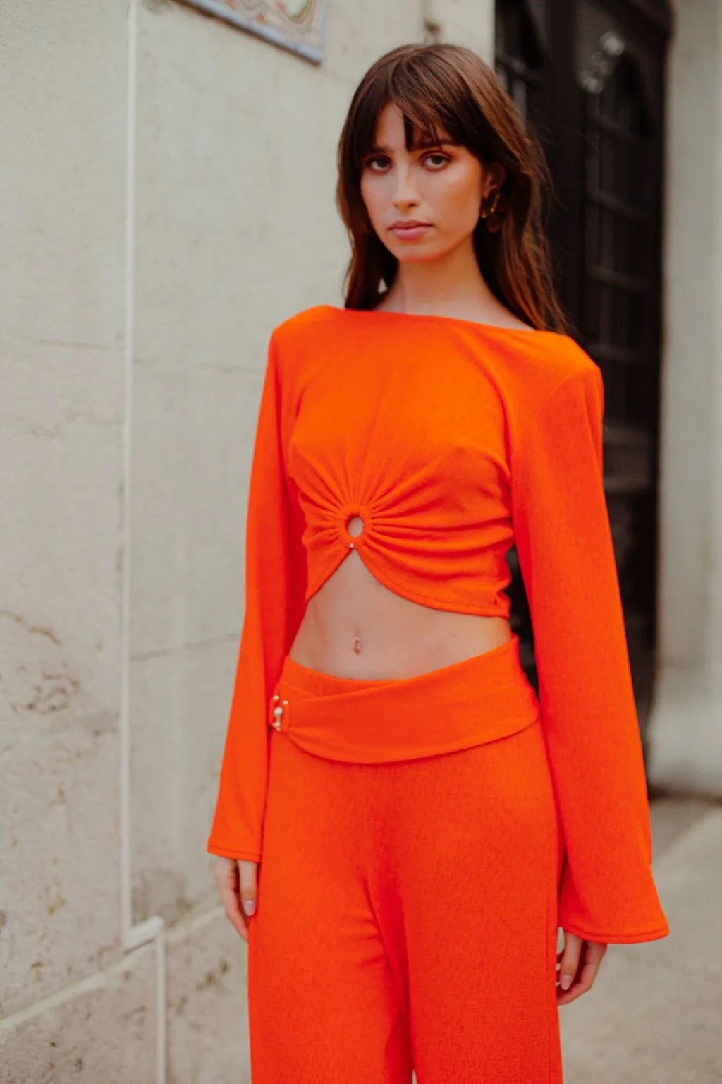 Le Top Perfection capture l’essence d’une élégance décontractée avec sa couleur orange vibrante et sa matière élastique qui épouse parfaitement les formes. Reprenant le design apprécié du Top Allure, il se caractérise par ses manches longues pagode, son col bateau élégant, et un décolleté rond attrayant dans le dos, complété par un détail d’anneau sur le devant et un lien à nouer au dos pour un ajustement sur mesure. Cette pièce combine confort et style, offrant une allure à la fois moderne et féminine, idéale pour rehausser n’importe quelle tenue avec une touche de couleur lumineuse et de sophistication.