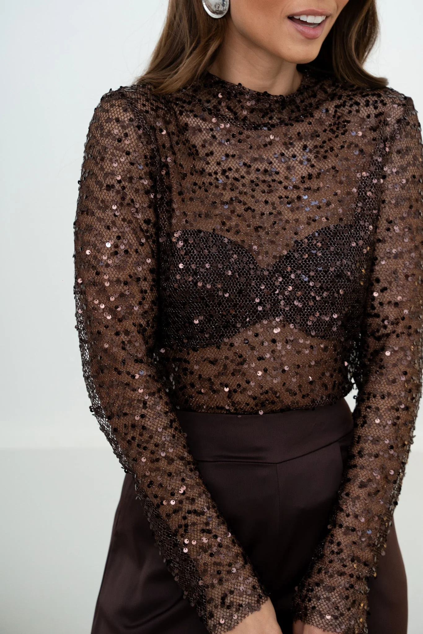 Top manches longues Col légèrement montant Sequin Mesures à plat en CM : Carrure / Epaule : SM 36 ML 38 Poitrine : SM 44 ML 46 Longueur depuis épaule : SM 62 ML 62 La mannequin mesure 173cm et porte une taille SM.