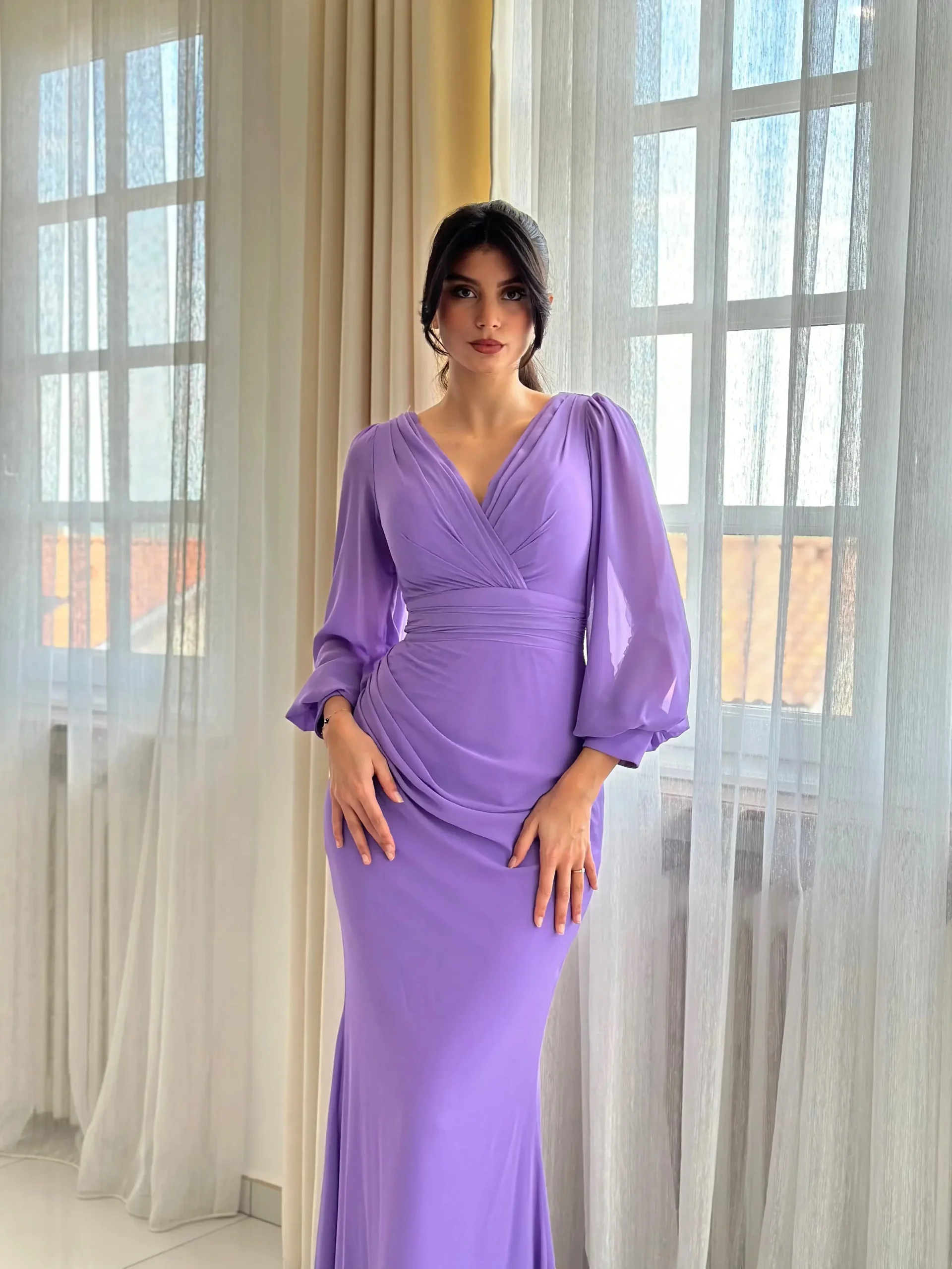 Longue robe couleur lila, sans fente.
