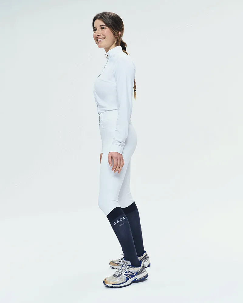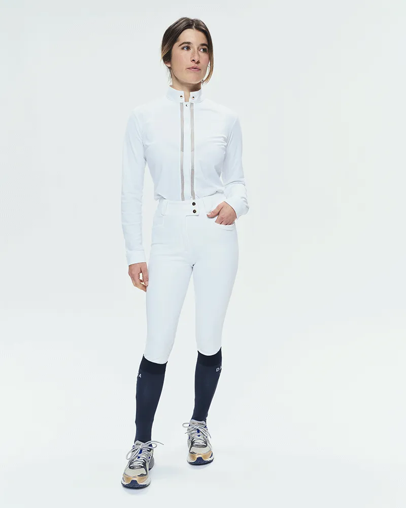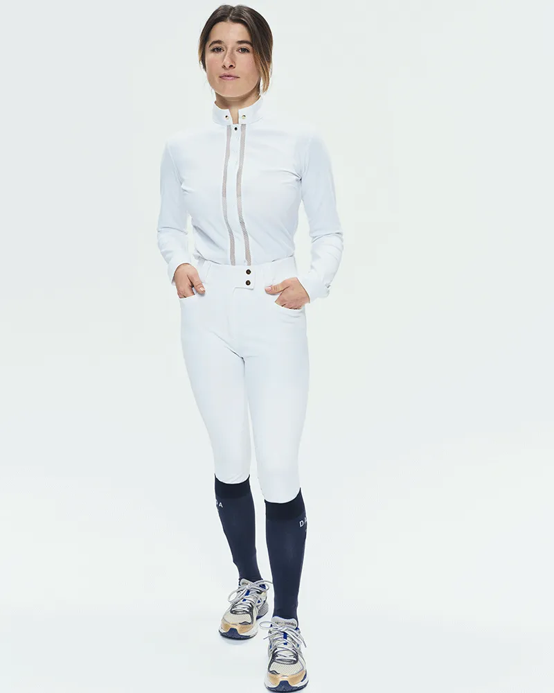 Chemise technique d’équitation à manches longues. Sa coupe pensée pour les cavalières est cintrée mais non ajustée pour souligner la taille.